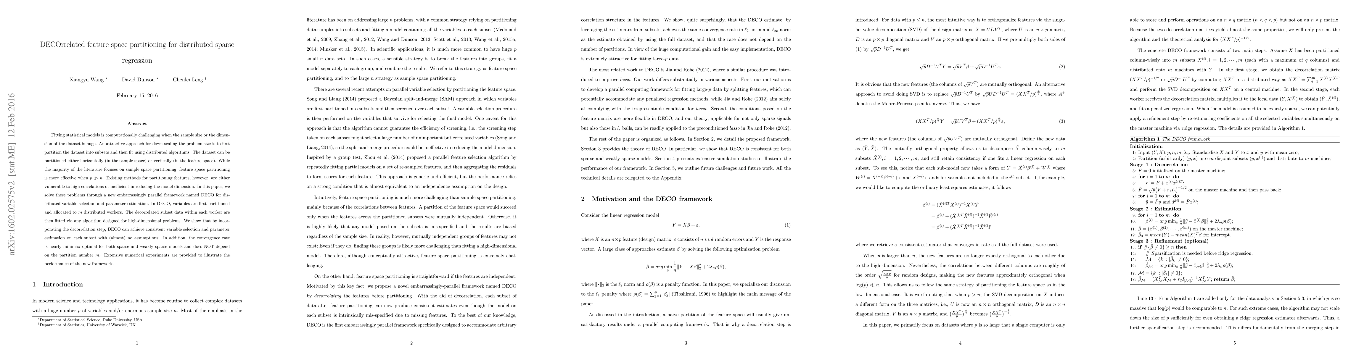 This paper introduces DECO, a framework for distributed sparse regression that partitions features to address high correlations and model dimension reduction. DECO achieves consistent variable selection and parameter estimation with near-optimal convergence rates, independent of the number of partitions, and demonstrates superior performance through extensive numerical experiments.