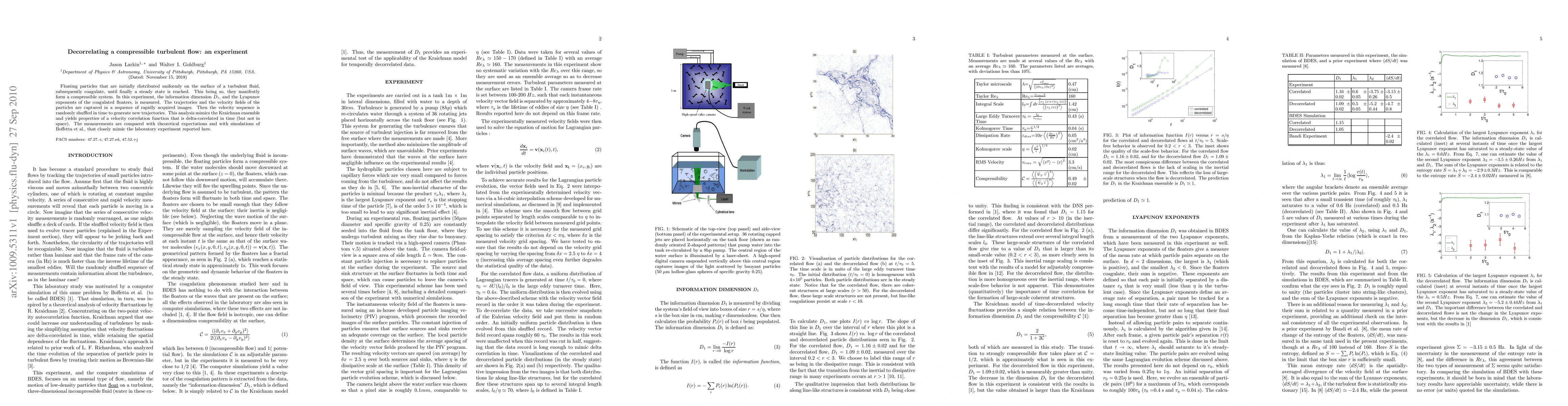 Floating particles that are initially distributed uniformly on the surface of a turbulent fluid, subsequently coagulate, until finally a steady state is reached. This being so, they manifestly form a compressible system. In this experiment, the information dimension D_1, and the Lyapunov exponents of the coagulated floaters, are measured. The trajectories and the velocity fields of the particles are captured in a sequence of rapidly acquired images. Then the velocity sequence is randomly shuffled in time to generate new trajectories. This analysis mimics the Kraichnan ensemble and yields properties of a velocity correlation function that is delta-correlated in time (but not in space). The measurements are compared with theoretical expectations and with simulations of Boffetta et al., that closely mimic the laboratory experiment reported here.