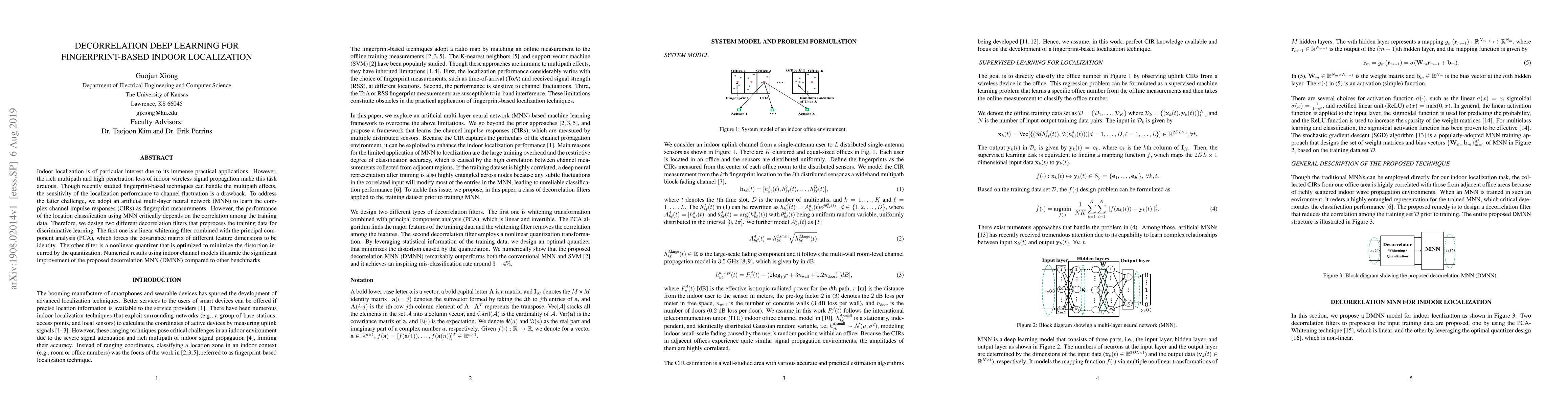 This paper proposes a decorrelation deep learning method for fingerprint-based indoor localization, addressing the sensitivity to channel fluctuations. It employs a multi-layer neural network to learn complex channel responses and uses two decorrelation filters—a linear whitening filter combined with PCA and a nonlinear quantizer—to improve training data discrimination, resulting in significant performance improvements over benchmarks.