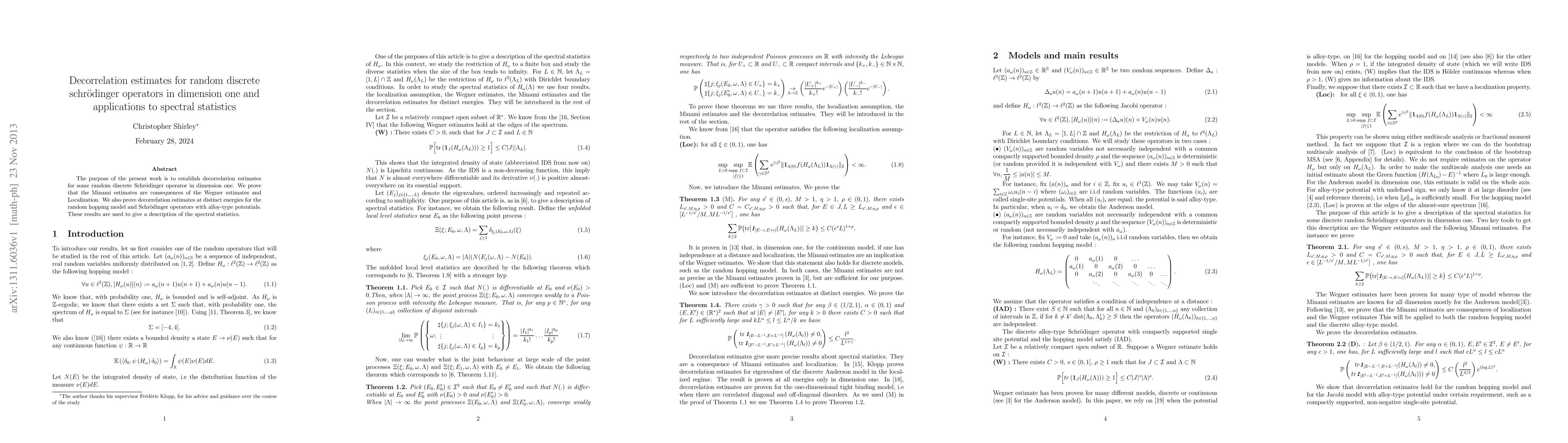 The purpose of the present work is to establish decorrelation estimates for some random discrete Schrodinger operator in dimension one. We prove that the Minami estimates are consequences of the Wegner estimates and Localization. We also prove decorrelation estimates at distinct energies for the random hopping model and Schrodinger operators with alloy-type potentials. These results are used to give a description of the spectral statistics.