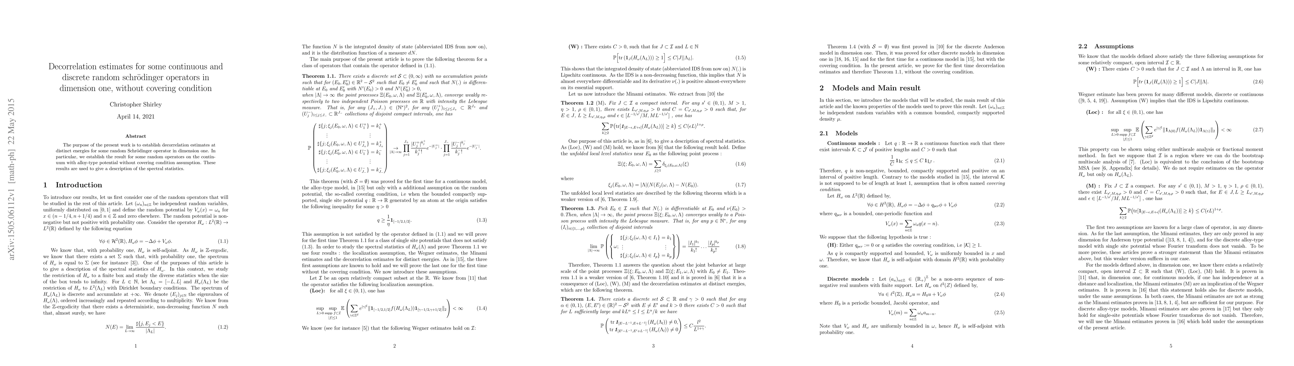 This paper establishes decorrelation estimates for random one-dimensional Schrödinger operators, particularly focusing on continuum operators with alloy-type potentials, without relying on the covering condition. These findings contribute to the understanding of the spectral statistics of such operators.
