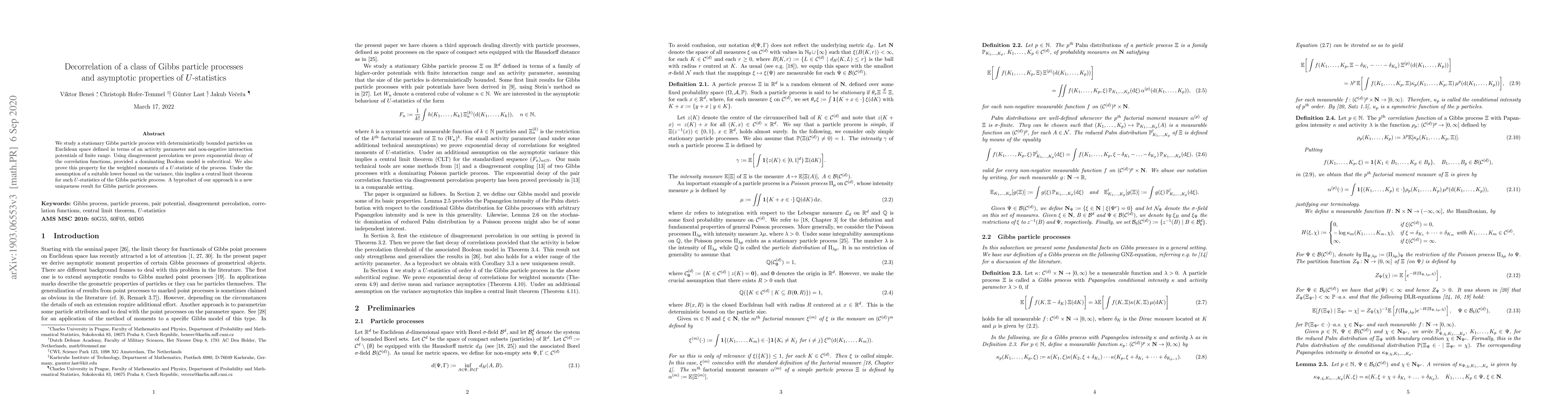 This paper investigates the decorrelation properties of a stationary Gibbs particle process, proving exponential decay of correlation functions and establishing a central limit theorem for U-statistics under certain conditions. The study also yields a new uniqueness result for Gibbs particle processes.