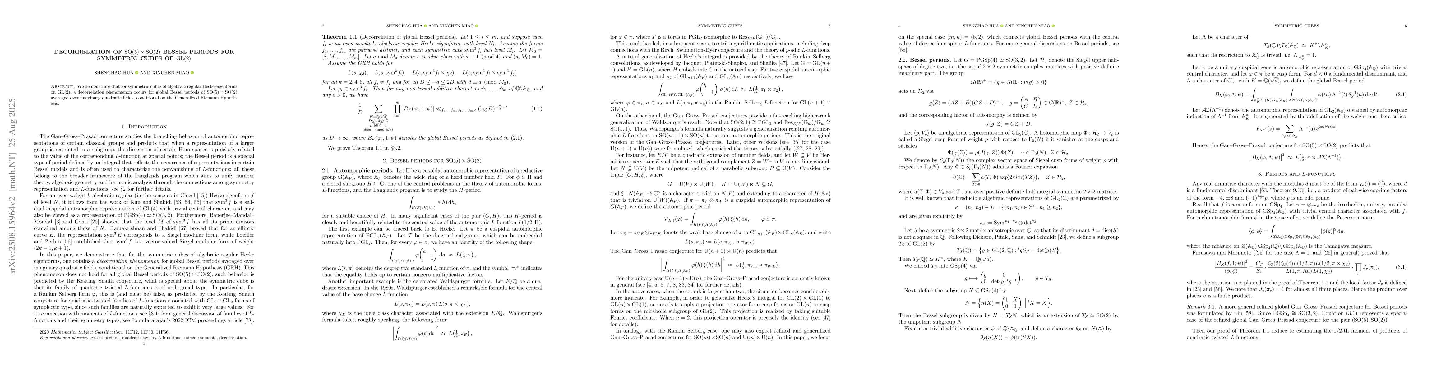 We demonstrate that for symmetric cubes of algebraic regular Hecke eigenforms on $\mathrm{GL}(2)$, a decorrelation phenomenon occurs for global Bessel periods of $\mathrm{SO}(5)\times \mathrm{SO}(2)$ averaged over imaginary quadratic fields, conditional on the Generalized Riemann Hypothesis.