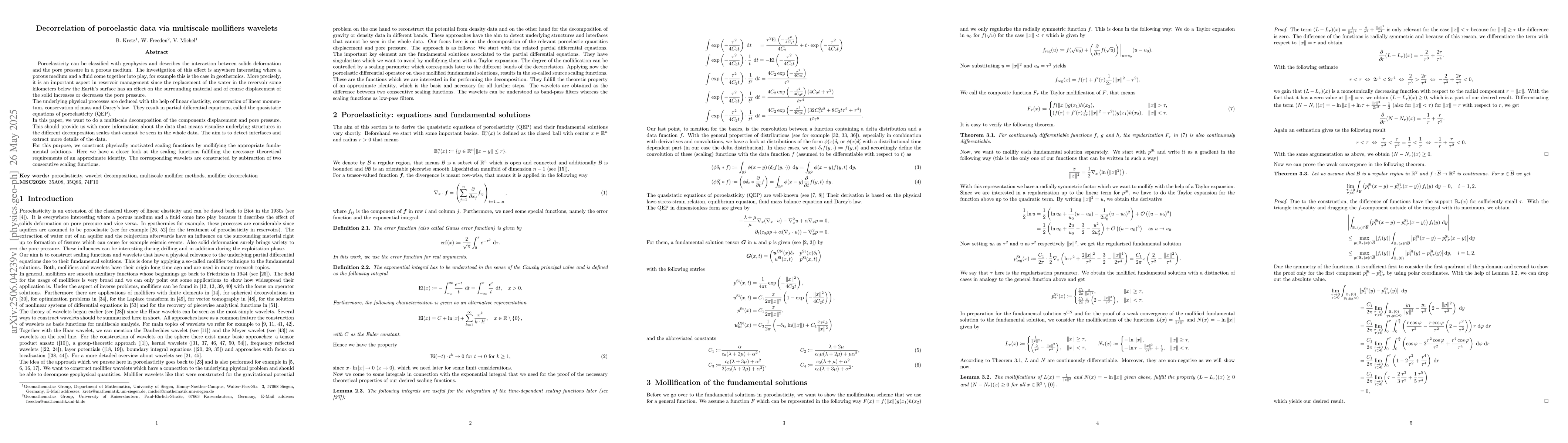 This work introduces a novel approach using mollifiers to construct scaling functions, differentiating it from existing wavelet-based methods in poroelastic data analysis.