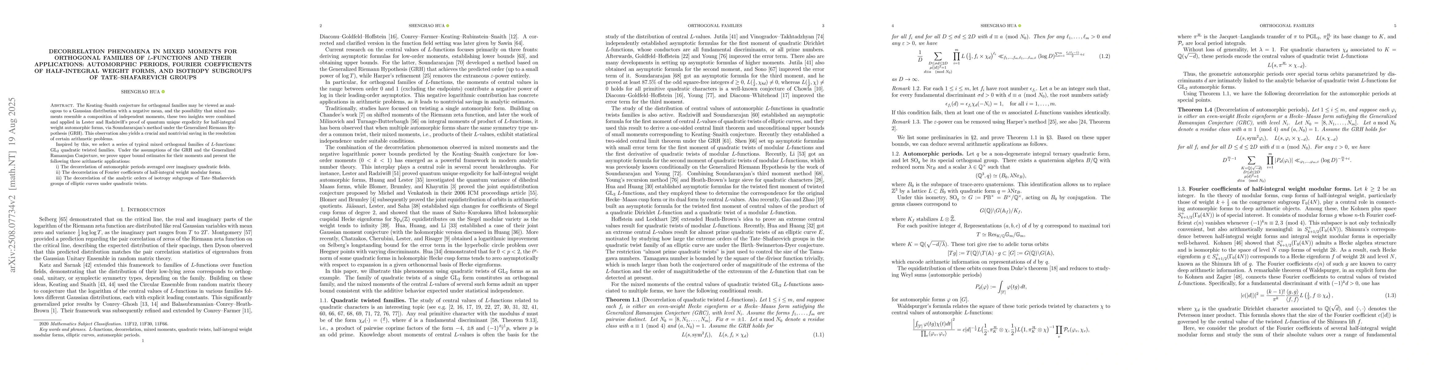 The Keating--Snaith conjecture for orthogonal families may be viewed as analogous to a Gaussian distribution with a negative mean, and the possibility that mixed moments resemble a composition of independent moments, these two insights were combined and applied in Lester and Radziwi\l\l's proof of quantum unique ergodicity for half-integral weight automorphic forms, via Soundararajan's method under the Generalized Riemann Hypothesis (GRH). This observation also yields a crucial and nontrivial saving in the resolution of certain arithmetic problems. Inspired by this, we select a series of typical mixed orthogonal families of $L$-functions: $\mathrm{GL}_2$ quadratic twisted families. Under the assumptions of the GRH and the Generalized Ramanujan Conjecture, we prove upper bound estimates for their moments and present the following three arithmetic applications: i) The decorrelation of automorphic periods averaged over imaginary quadratic fields. ii) The decorrelation of Fourier coefficients of half-integral weight modular forms. iii) The decorrelation of the analytic orders of isotropy subgroups of Tate--Shafarevich groups of elliptic curves under quadratic twists.