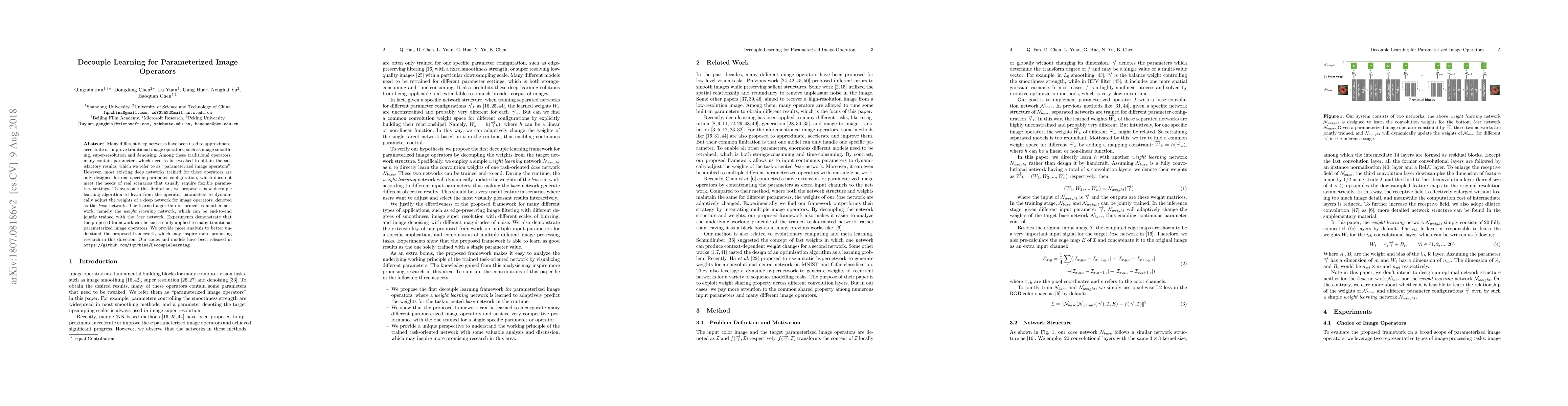 This research introduces a decouple learning algorithm for parameterized image operators, enabling dynamic adjustment of deep network weights based on operator parameters. The method, called the weight learning network, can be jointly trained with a base network for various image operations, demonstrating successful application across smoothing, super-resolution, and denoising tasks. The findings offer insights for further research in this area, with codes and models available at the provided GitHub link.