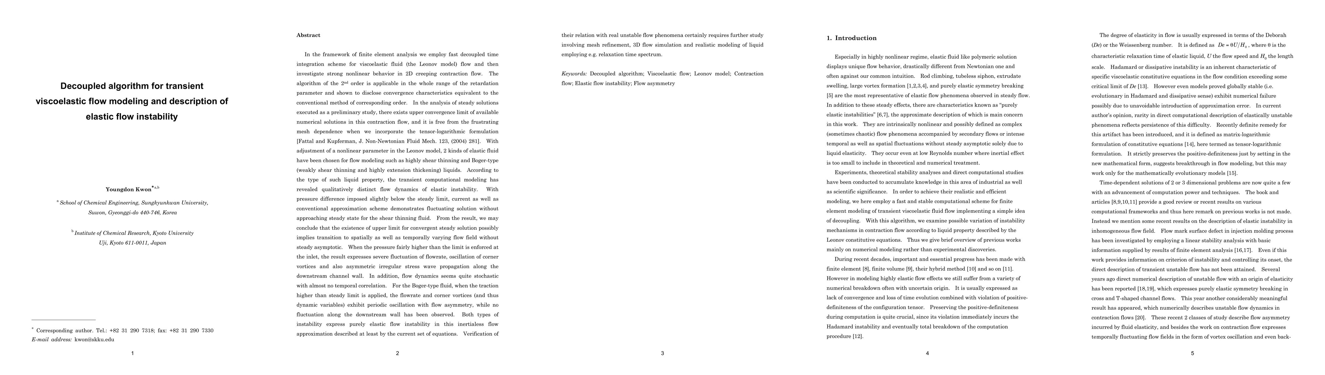 This paper presents a decoupled algorithm for transient viscoelastic flow modeling using the Leonov model in finite element analysis, revealing strong nonlinear behavior in 2D creeping contraction flow. The study identifies elastic flow instabilities, showing fluctuating and stochastic behavior in shear thinning fluids and periodic oscillations in Boger-type fluids, indicating purely elastic instabilities.