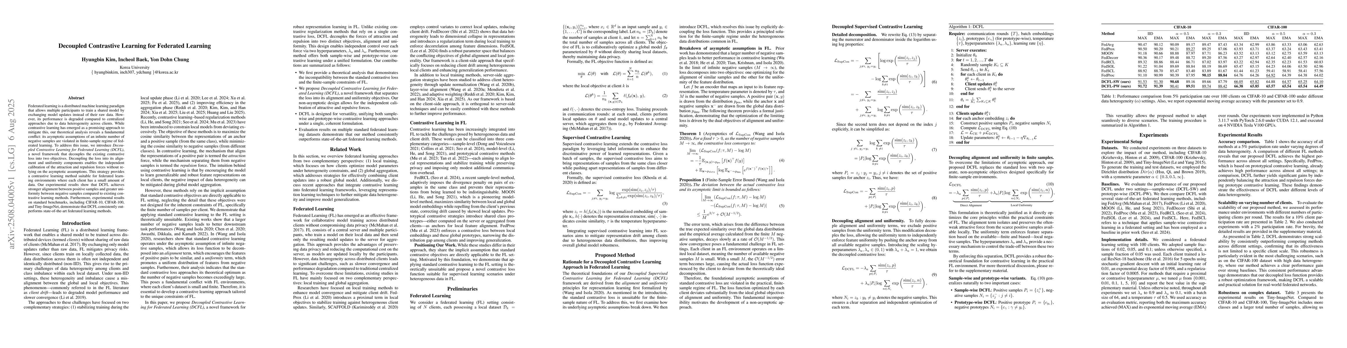 Federated learning is a distributed machine learning paradigm that allows multiple participants to train a shared model by exchanging model updates instead of their raw data. However, its performance is degraded compared to centralized approaches due to data heterogeneity across clients. While contrastive learning has emerged as a promising approach to mitigate this, our theoretical analysis reveals a fundamental conflict: its asymptotic assumptions of an infinite number of negative samples are violated in finite-sample regime of federated learning. To address this issue, we introduce Decoupled Contrastive Learning for Federated Learning (DCFL), a novel framework that decouples the existing contrastive loss into two objectives. Decoupling the loss into its alignment and uniformity components enables the independent calibration of the attraction and repulsion forces without relying on the asymptotic assumptions. This strategy provides a contrastive learning method suitable for federated learning environments where each client has a small amount of data. Our experimental results show that DCFL achieves stronger alignment between positive samples and greater uniformity between negative samples compared to existing contrastive learning methods. Furthermore, experimental results on standard benchmarks, including CIFAR-10, CIFAR-100, and Tiny-ImageNet, demonstrate that DCFL consistently outperforms state-of-the-art federated learning methods.