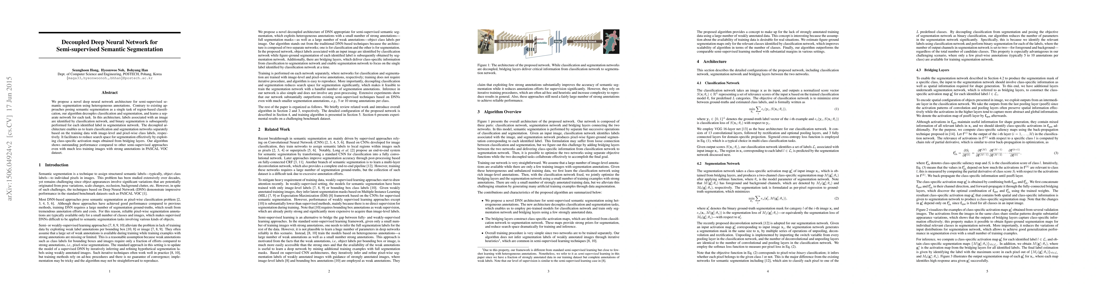 The paper introduces a decoupled deep neural network architecture for semi-supervised semantic segmentation that separates classification and segmentation tasks, leading to improved performance with fewer training images compared to existing methods. The approach effectively reduces the search space for segmentation using class-specific activation maps.