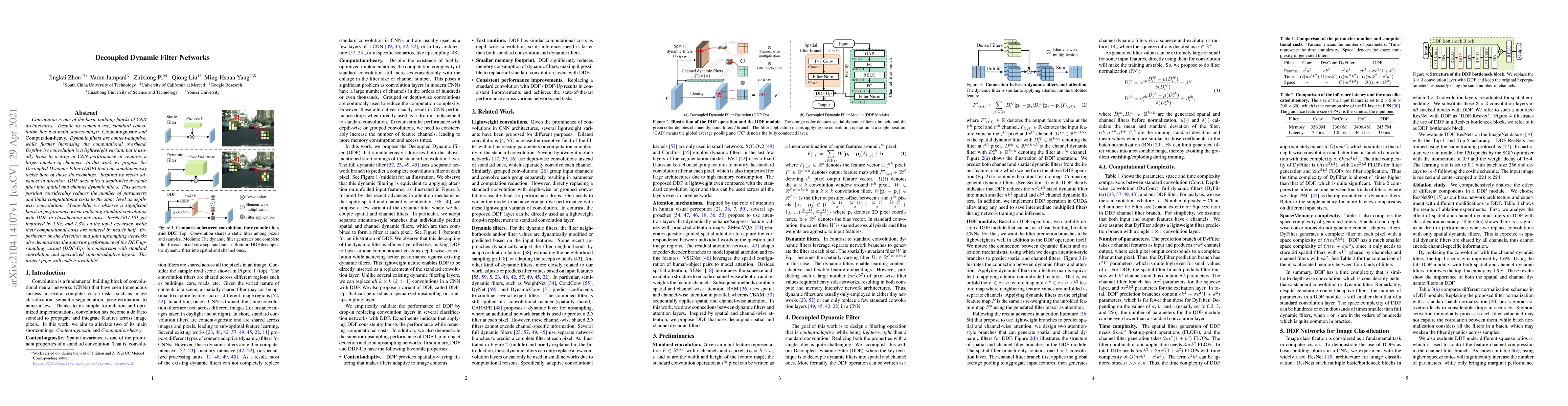 Convolution is one of the basic building blocks of CNN architectures. Despite its common use, standard convolution has two main shortcomings: Content-agnostic and Computation-heavy. Dynamic filters are content-adaptive, while further increasing the computational overhead. Depth-wise convolution is a lightweight variant, but it usually leads to a drop in CNN performance or requires a larger number of channels. In this work, we propose the Decoupled Dynamic Filter (DDF) that can simultaneously tackle both of these shortcomings. Inspired by recent advances in attention, DDF decouples a depth-wise dynamic filter into spatial and channel dynamic filters. This decomposition considerably reduces the number of parameters and limits computational costs to the same level as depth-wise convolution. Meanwhile, we observe a significant boost in performance when replacing standard convolution with DDF in classification networks. ResNet50 / 101 get improved by 1.9% and 1.3% on the top-1 accuracy, while their computational costs are reduced by nearly half. Experiments on the detection and joint upsampling networks also demonstrate the superior performance of the DDF upsampling variant (DDF-Up) in comparison with standard convolution and specialized content-adaptive layers.