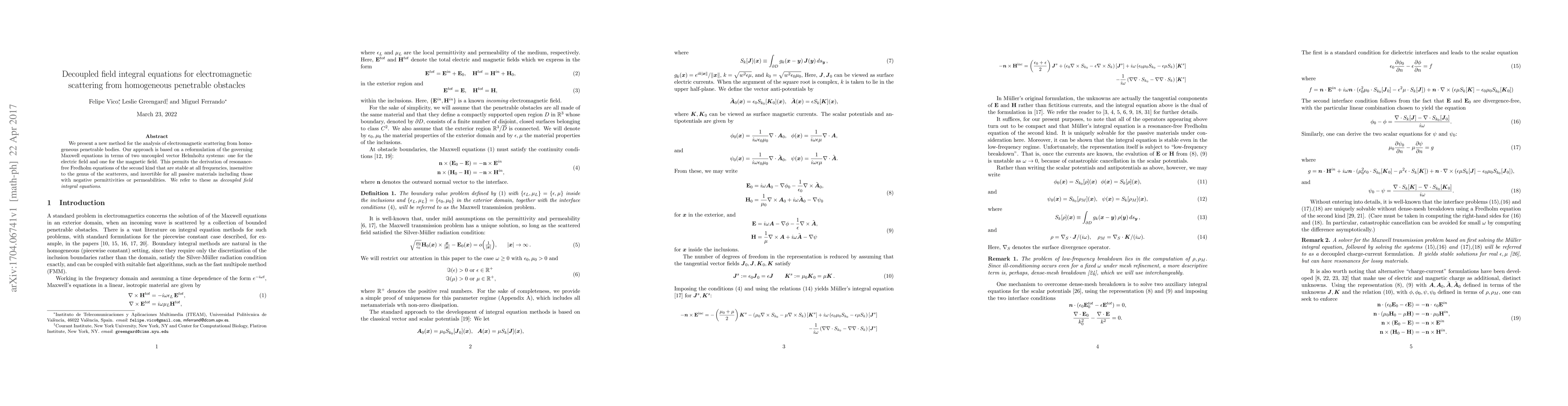 This paper introduces a new method for electromagnetic scattering analysis from homogeneous penetrable obstacles, reformulating Maxwell's equations into two uncoupled vector Helmholtz systems, leading to stable and invertible decoupled field integral equations that work across all frequencies and material types.