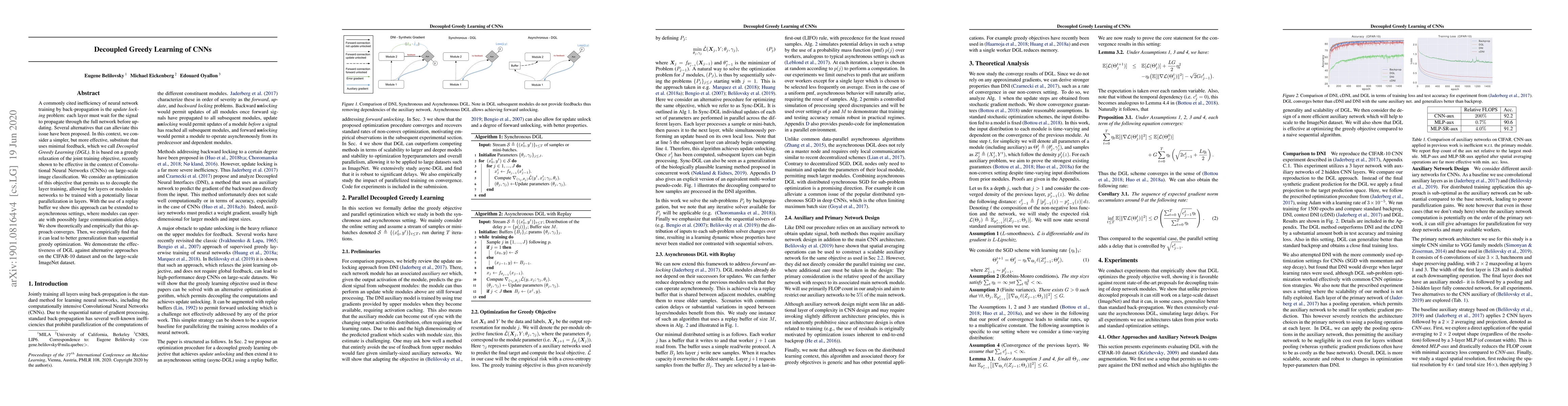 A commonly cited inefficiency of neural network training by back-propagation is the update locking problem: each layer must wait for the signal to propagate through the full network before updating. Several alternatives that can alleviate this issue have been proposed. In this context, we consider a simpler, but more effective, substitute that uses minimal feedback, which we call Decoupled Greedy Learning (DGL). It is based on a greedy relaxation of the joint training objective, recently shown to be effective in the context of Convolutional Neural Networks (CNNs) on large-scale image classification. We consider an optimization of this objective that permits us to decouple the layer training, allowing for layers or modules in networks to be trained with a potentially linear parallelization in layers. With the use of a replay buffer we show this approach can be extended to asynchronous settings, where modules can operate with possibly large communication delays. We show theoretically and empirically that this approach converges. Then, we empirically find that it can lead to better generalization than sequential greedy optimization. We demonstrate the effectiveness of DGL against alternative approaches on the CIFAR-10 dataset and on the large-scale ImageNet dataset.