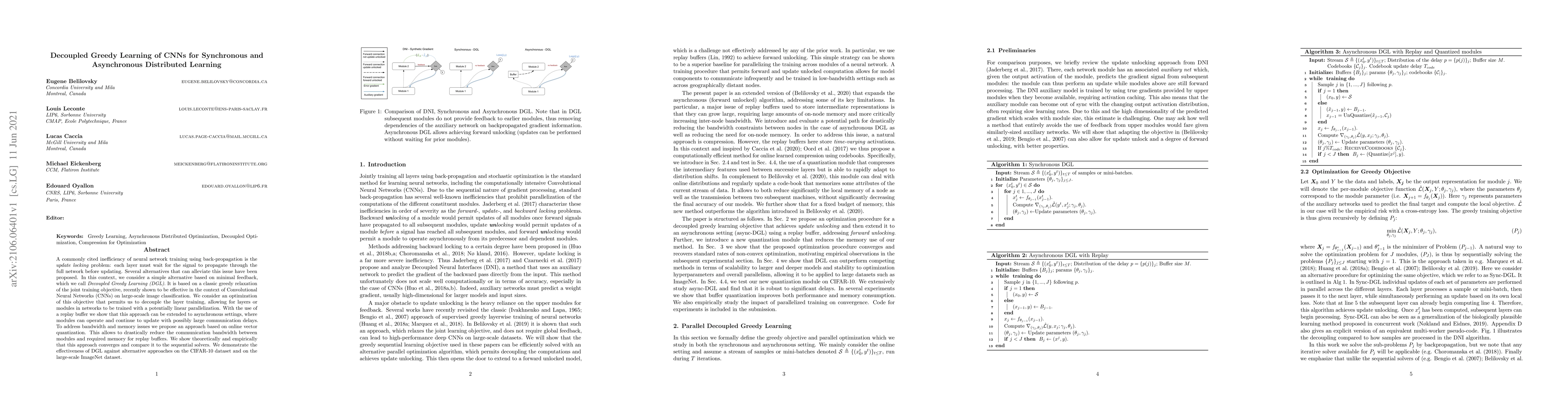 A commonly cited inefficiency of neural network training using back-propagation is the update locking problem: each layer must wait for the signal to propagate through the full network before updating. Several alternatives that can alleviate this issue have been proposed. In this context, we consider a simple alternative based on minimal feedback, which we call Decoupled Greedy Learning (DGL). It is based on a classic greedy relaxation of the joint training objective, recently shown to be effective in the context of Convolutional Neural Networks (CNNs) on large-scale image classification. We consider an optimization of this objective that permits us to decouple the layer training, allowing for layers or modules in networks to be trained with a potentially linear parallelization. With the use of a replay buffer we show that this approach can be extended to asynchronous settings, where modules can operate and continue to update with possibly large communication delays. To address bandwidth and memory issues we propose an approach based on online vector quantization. This allows to drastically reduce the communication bandwidth between modules and required memory for replay buffers. We show theoretically and empirically that this approach converges and compare it to the sequential solvers. We demonstrate the effectiveness of DGL against alternative approaches on the CIFAR-10 dataset and on the large-scale ImageNet dataset.