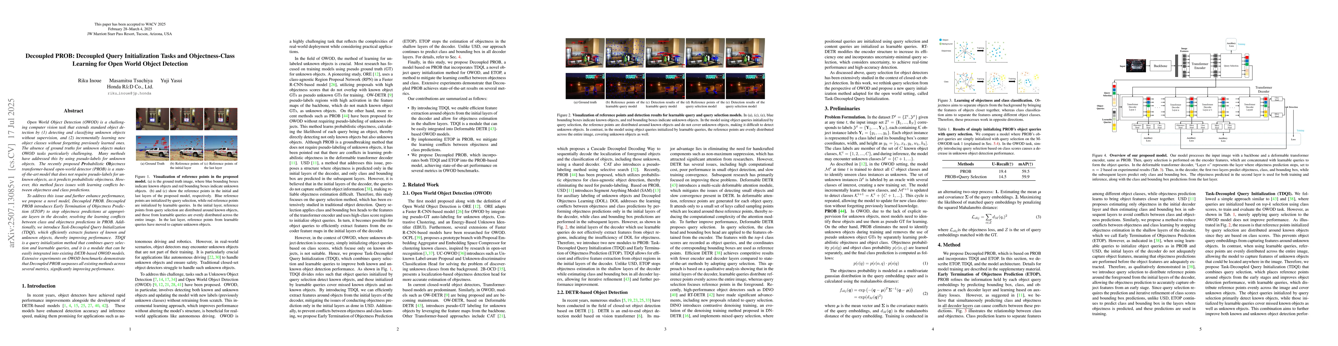 Open World Object Detection (OWOD) is a challenging computer vision task that extends standard object detection by (1) detecting and classifying unknown objects without supervision, and (2) incrementally learning new object classes without forgetting previously learned ones. The absence of ground truths for unknown objects makes OWOD tasks particularly challenging. Many methods have addressed this by using pseudo-labels for unknown objects. The recently proposed Probabilistic Objectness transformer-based open-world detector (PROB) is a state-of-the-art model that does not require pseudo-labels for unknown objects, as it predicts probabilistic objectness. However, this method faces issues with learning conflicts between objectness and class predictions. To address this issue and further enhance performance, we propose a novel model, Decoupled PROB. Decoupled PROB introduces Early Termination of Objectness Prediction (ETOP) to stop objectness predictions at appropriate layers in the decoder, resolving the learning conflicts between class and objectness predictions in PROB. Additionally, we introduce Task-Decoupled Query Initialization (TDQI), which efficiently extracts features of known and unknown objects, thereby improving performance. TDQI is a query initialization method that combines query selection and learnable queries, and it is a module that can be easily integrated into existing DETR-based OWOD models. Extensive experiments on OWOD benchmarks demonstrate that Decoupled PROB surpasses all existing methods across several metrics, significantly improving performance.