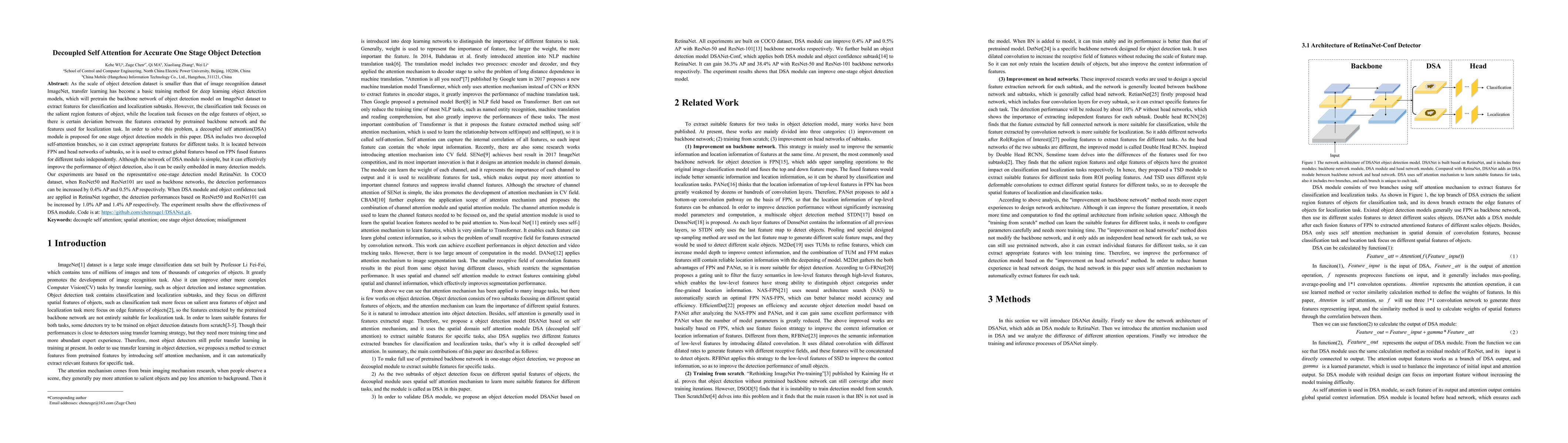 This paper proposes a Decoupled Self Attention (DSA) module to improve one-stage object detection models by extracting features tailored for classification and localization tasks independently. Experiments on RetinaNet with COCO dataset show performance gains of up to 1.4% AP using ResNet101 as the backbone.