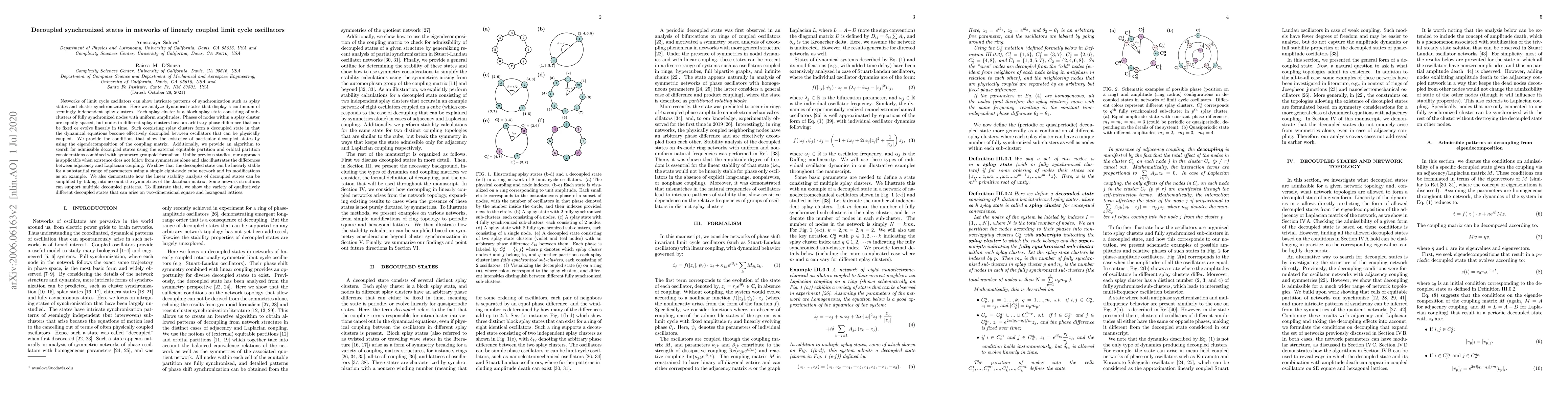 Networks of limit cycle oscillators can show intricate patterns of synchronization such as splay states and cluster synchronization. Here we analyze dynamical states that display a continuum of seemingly independent splay clusters. Each splay cluster is a block splay state consisting of sub-clusters of fully synchronized nodes with uniform amplitudes. Phases of nodes within a splay cluster are equally spaced, but nodes in different splay clusters have an arbitrary phase difference that can be fixed or evolve linearly in time. Such coexisting splay clusters form a decoupled state in that the dynamical equations become effectively decoupled between oscillators that can be physically coupled. We provide the conditions that allow the existence of particular decoupled states by using the eigendecomposition of the coupling matrix. Additionally, we provide an algorithm to search for admissible decoupled states using the external equitable partition and orbital partition considerations combined with symmetry groupoid formalism. Unlike previous studies, our approach is applicable when existence does not follow from symmetries alone and also illustrates the differences between adjacency and Laplacian coupling. We show that the decoupled state can be linearly stable for a substantial range of parameters using a simple eight-node cube network and its modifications as an example. We also demonstrate how the linear stability analysis of decoupled states can be simplified by taking into account the symmetries of the Jacobian matrix. Some network structures can support multiple decoupled patterns. To illustrate that, we show the variety of qualitatively different decoupled states that can arise on two-dimensional square and hexagonal lattices.