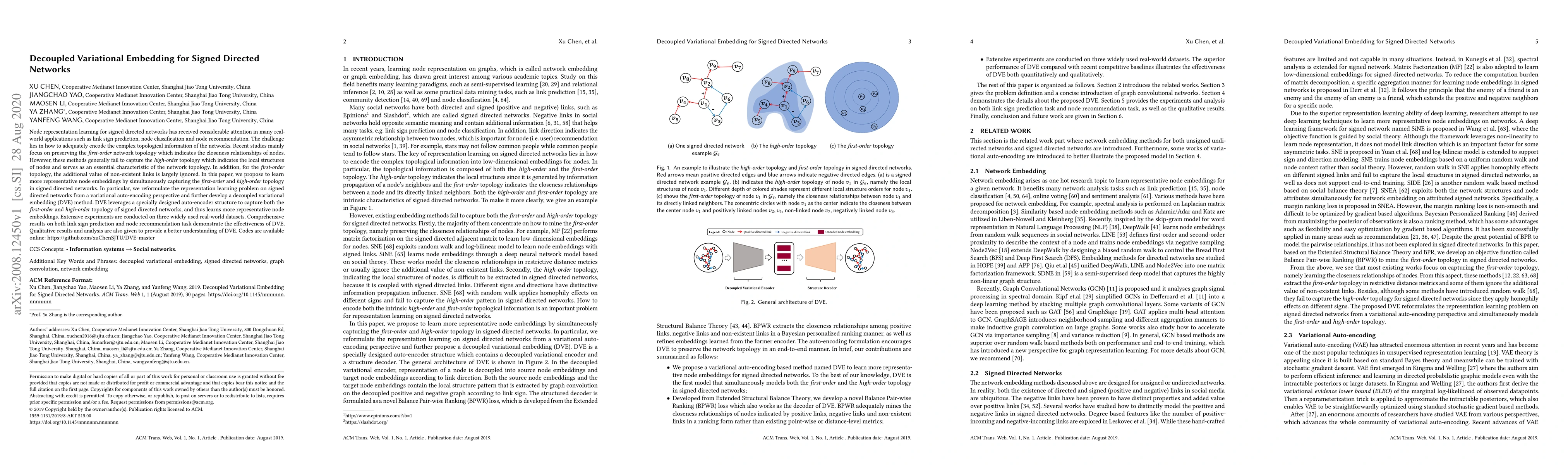 This paper proposes a decoupled variational embedding (DVE) method to learn representative node embeddings for signed directed networks by capturing both first-order and high-order topological information. The DVE method addresses the limitations of existing methods that focus only on first-order topology and ignores non-existent links, demonstrating improved performance in link sign prediction and node recommendation tasks.
