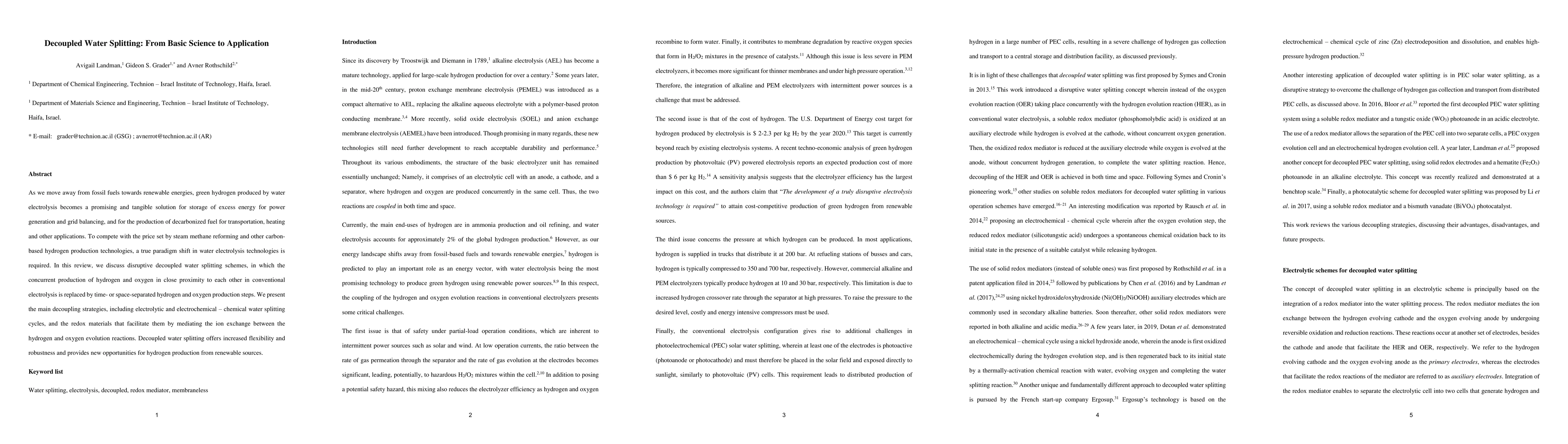 This review explores innovative decoupled water splitting methods that separate hydrogen and oxygen production, enhancing flexibility and robustness for hydrogen generation from renewable energy sources. It highlights various decoupling strategies and the redox materials that enable ion exchange between hydrogen and oxygen evolution reactions.