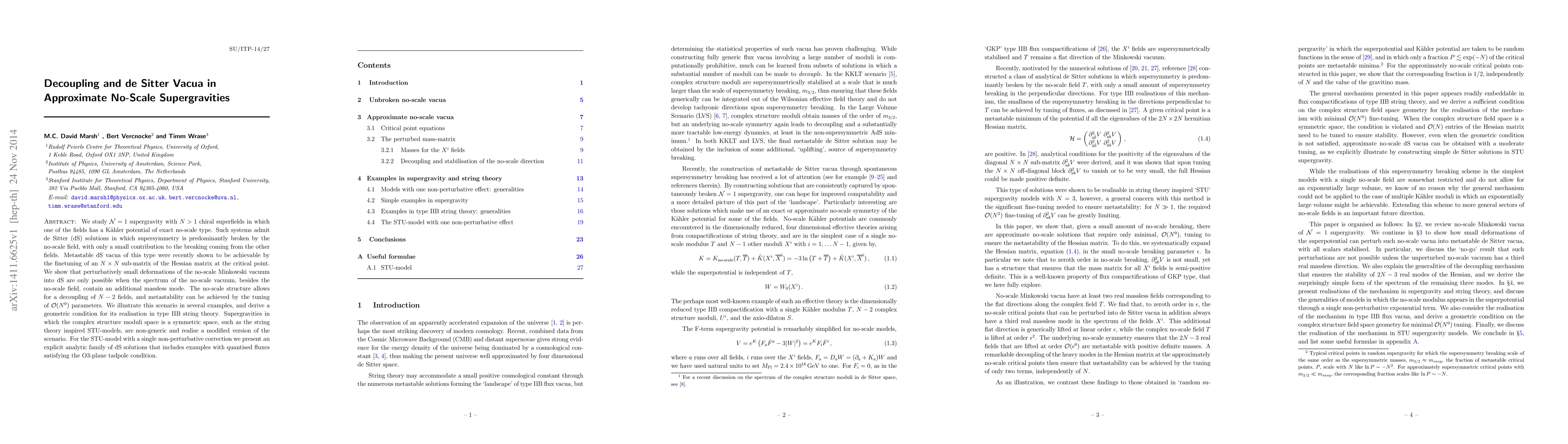 We study ${\cal N}=1$ supergravity with $N>1$ chiral superfields in which one of the fields has a K\"ahler potential of exact no-scale type. Such systems admit de Sitter (dS) solutions in which supersymmetry is predominantly broken by the no-scale field, with only a small contribution to the breaking coming from the other fields. Metastable dS vacua of this type were recently shown to be achievable by the finetuning of an $N\times N$ sub-matrix of the Hessian matrix at the critical point. We show that perturbatively small deformations of the no-scale Minkowski vacuum into dS are only possible when the spectrum of the no-scale vacuum, besides the no-scale field, contain an additional massless mode. The no-scale structure allows for a decoupling of $N-2$ fields, and metastability can be achieved by the tuning of ${\cal O}(N^0)$ parameters. We illustrate this scenario in several examples, and derive a geometric condition for its realisation in type IIB string theory. Supergravities in which the complex structure moduli space is a symmetric space, such as the string theory inspired STU-models, are non-generic and realise a modified version of the scenario. For the STU-model with a single non-perturbative correction we present an explicit analytic family of dS solutions that includes examples with quantised fluxes satisfying the O3-plane tadpole condition.