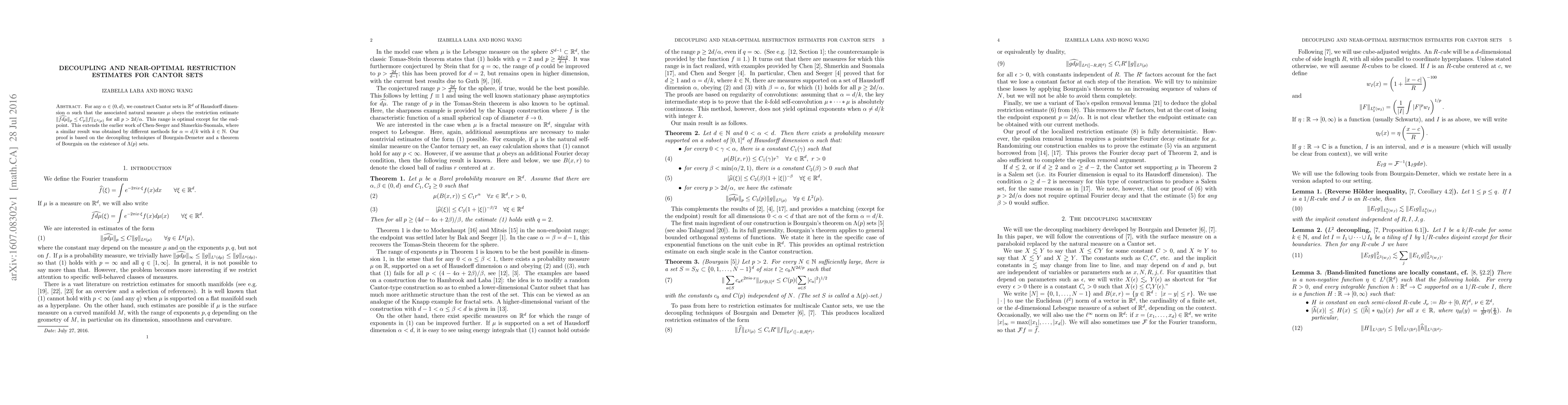 This paper constructs Cantor sets with specified Hausdorff dimension that satisfy near-optimal restriction estimates, extending previous results by utilizing decoupling techniques and Bourgain's theorem on $\Lambda(p)$ sets. The estimates hold for a range of $p$ values, optimal except at the endpoint.