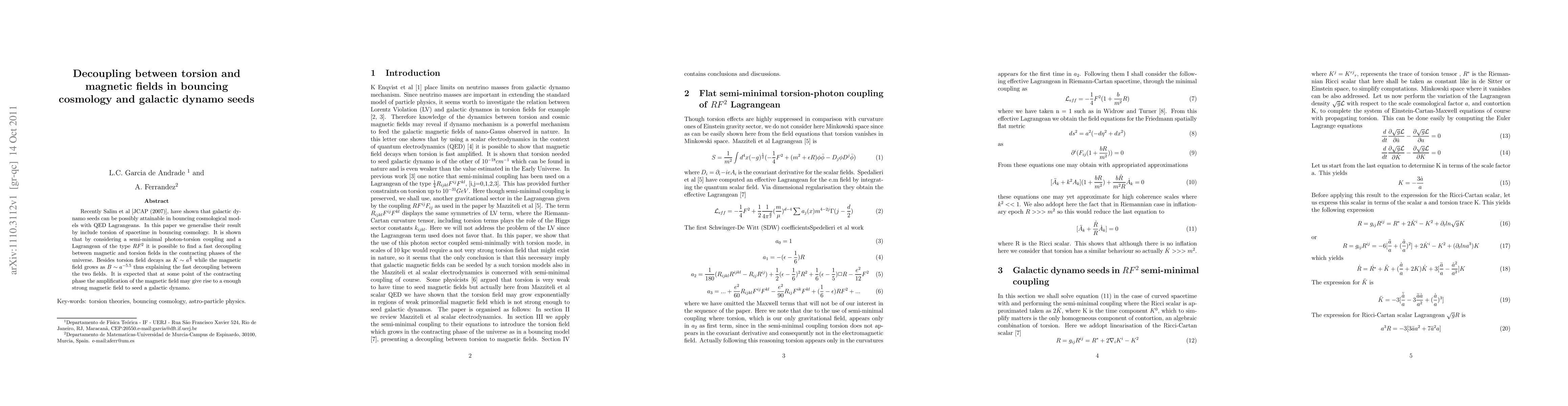 Recently Salim et al [JCAP (2007)], have shown that galactic dynamo seeds can be possibly attainable in bouncing cosmological models with QED Lagrangeans. In this paper we generalise their result by include torsion of spacetime in bouncing cosmology. It is shown that by considering a semi-minimal photon-torsion coupling and a Lagrangean of the type $RF^{2}$ it is possible to find a fast decoupling between magnetic and torsion fields in the contracting phases of the universe. Besides torsion field decays as $K\sim{a^{2/3}}$ while the magnetic field grows as $B\sim{a^{-5.5}}$ thus explaining the fast decoupling between the two fields. It is expected that at some point of the contracting phase the amplification of the magnetic field may give rise to a enough strong magnetic field to seed a galactic dynamo.