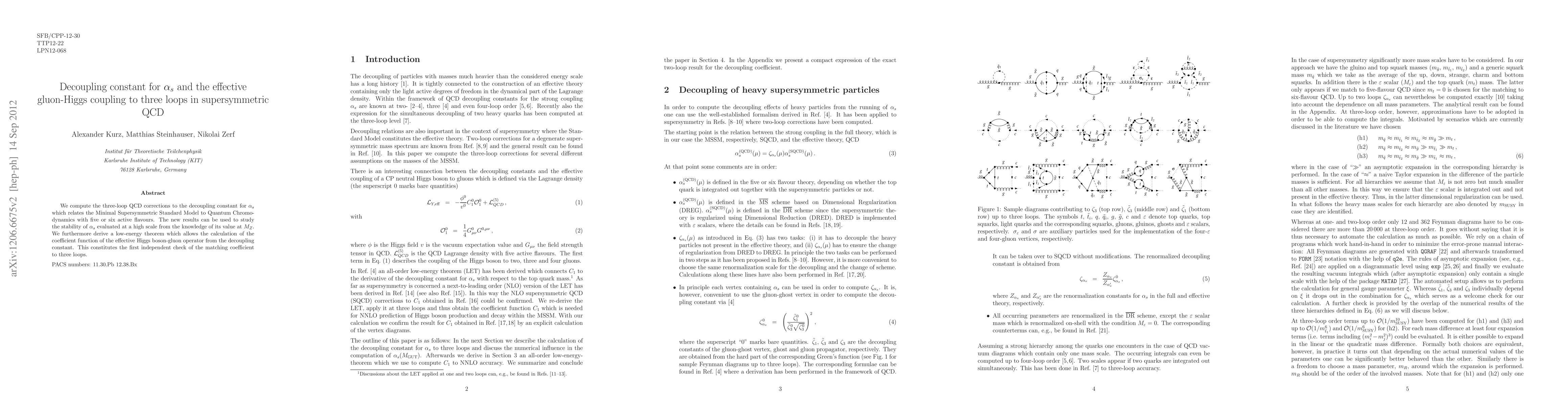 This paper computes the three-loop QCD corrections to the decoupling constant for $\alpha_s$ in supersymmetric QCD, providing insights into the stability of $\alpha_s$ at high scales. It also derives a low-energy theorem for the effective gluon-Higgs coupling, offering a first independent verification of the matching coefficient to three loops.