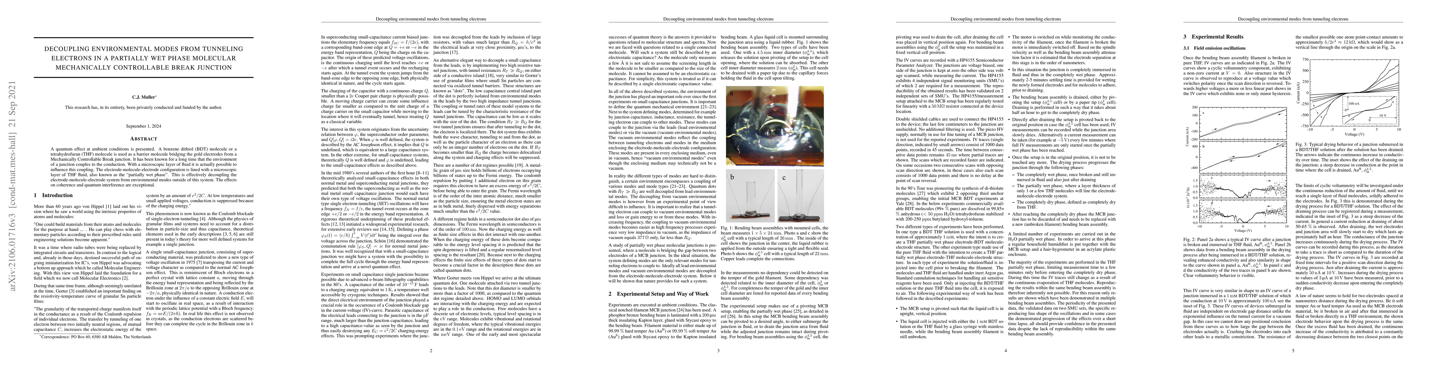 A quantum effect at ambient conditions is presented. A benzene dithiol (BDT) molecule or a tetrahydrofuran (THF) molecule is used as a barrier molecule bridging the gold electrodes from a Mechanically Controllable Break junction. It has been known for a long time that the environment of a junction couples to the conduction. With a microscopic layer of fluid it is actually possible to influence this coupling. The electrode-molecule-electrode configuration is lined with a microscopic layer of THF fluid, also known as the partially wet phase. This is effectively decoupling the electrode-molecule-electrode system from environmental modes outside of this system. The effects on coherence and quantum interference are exceptional.