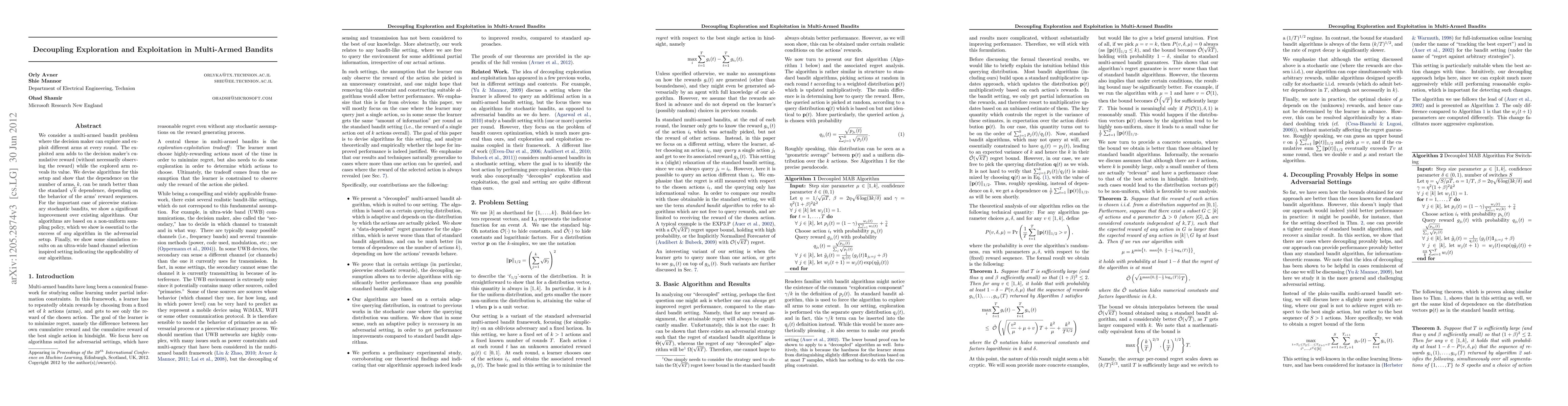 This paper proposes advanced algorithms for multi-armed bandit problems that effectively decouple exploration and exploitation, achieving better performance than standard algorithms by reducing the dependence on the number of arms. The proposed non-uniform sampling policy significantly improves results in the context of piecewise stationary stochastic bandits and demonstrates practical applicability in channel selection.