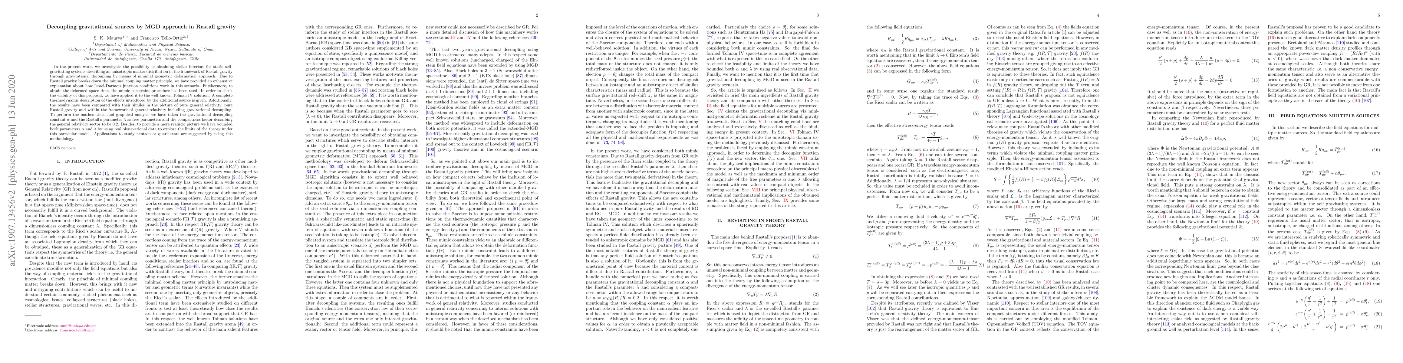 In the present work, we investigate the possibility of obtaining stellar interiors for static self-gravitating systems describing an anisotropic matter distribution in the framework of Rastall gravity through gravitational decoupling by means of minimal geometric deformation approach. Due to Rastall gravity breaks down the minimal coupling matter principle, we have provided an exhaustive explanation about how Israel-Darmois junction conditions work in this scenario. Furthermore, to obtain the deformed space-time, the mimic constraint procedure has been used. In order to check the viability of this proposal, we have applied it to the well known Tolman IV solution. A complete thermodynamic description of the effects introduced by the additional source is given. Additionally, the results have been compared with their similes in the picture of pure general relativity, pure Rastall gravity and within the framework of general relativity including gravitational decoupling. To perform the mathematical and graphical analysis we have taken the gravitational decoupling constant $\alpha$ and the Rastall's parameter $\lambda$ as free parameters and the compactness factor describing the general relativity sector to be $0.2$. Besides, to provide a more realistic picture we have bounded both parameters $\alpha$ and $\lambda$ by using real observational data to explore the limits of the theory under this particular model. Applications to study neutron or quark stars are suggested by using this methodology.