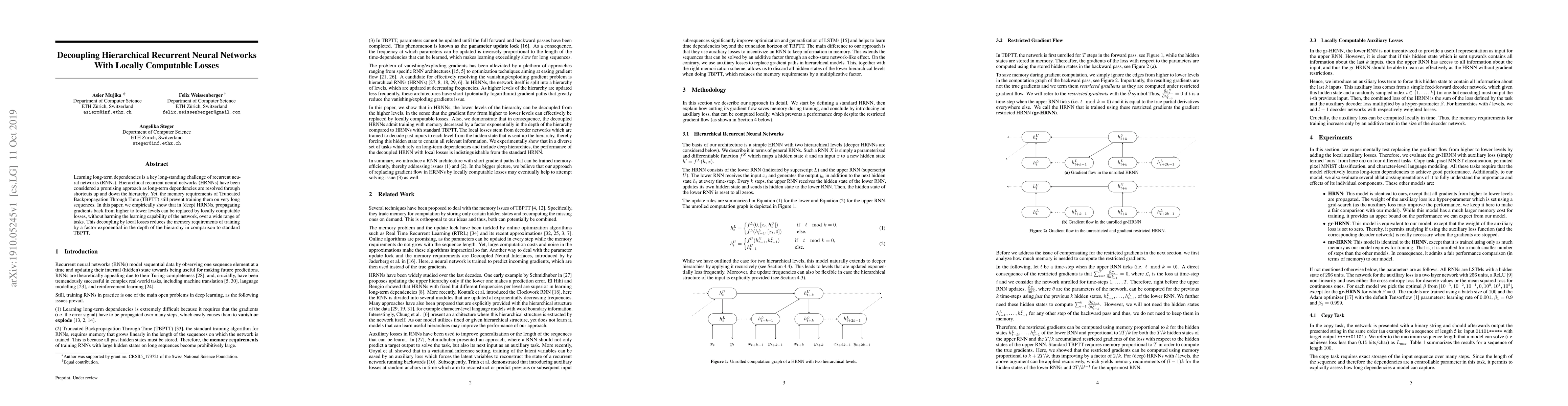 This paper proposes using locally computable losses to replace gradient backpropagation in hierarchical recurrent neural networks (HRNNs), significantly reducing memory requirements without compromising learning capability. This approach effectively decouples the training process and allows HRNNs to handle much longer sequences than traditional methods.