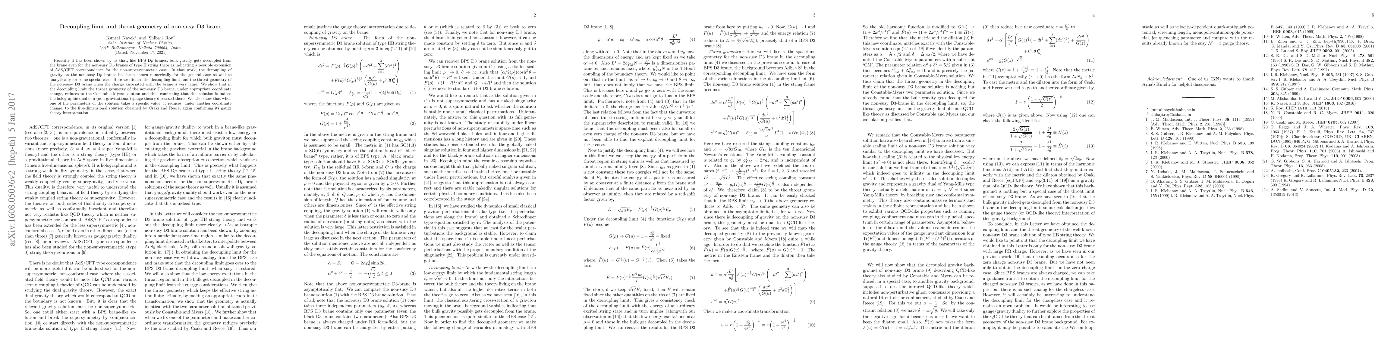 In a previous work, we have shown that, like BPS Dp branes, bulk gravity gets decoupled from the brane even for the non-susy Dp branes of type II string theories indicating a possible extension of AdS/CFT correspondence for the non-supersymmetric case. In that work, the decoupling of gravity on the non-susy Dp branes has been shown numerically for the general case as well as analytically for some special case. Here we discuss the decoupling limit and the throat geometry of the non-susy D3 brane when the charge associated with the brane is very large. We show that in the decoupling limit the throat geometry of the non-susy D3 brane, under appropriate coordinate change, reduces to the Constable-Myers solution and thus confirming that this solution is indeed the holographic dual of a (non-gravitational) gauge theory discussed there. We also show that when one of the parameters of the solution takes a specific value, it reduces, under another coordinate change, to the five-dimensional solution obtained by Csaki and Reece, again confirming its gauge theory interpretation.
