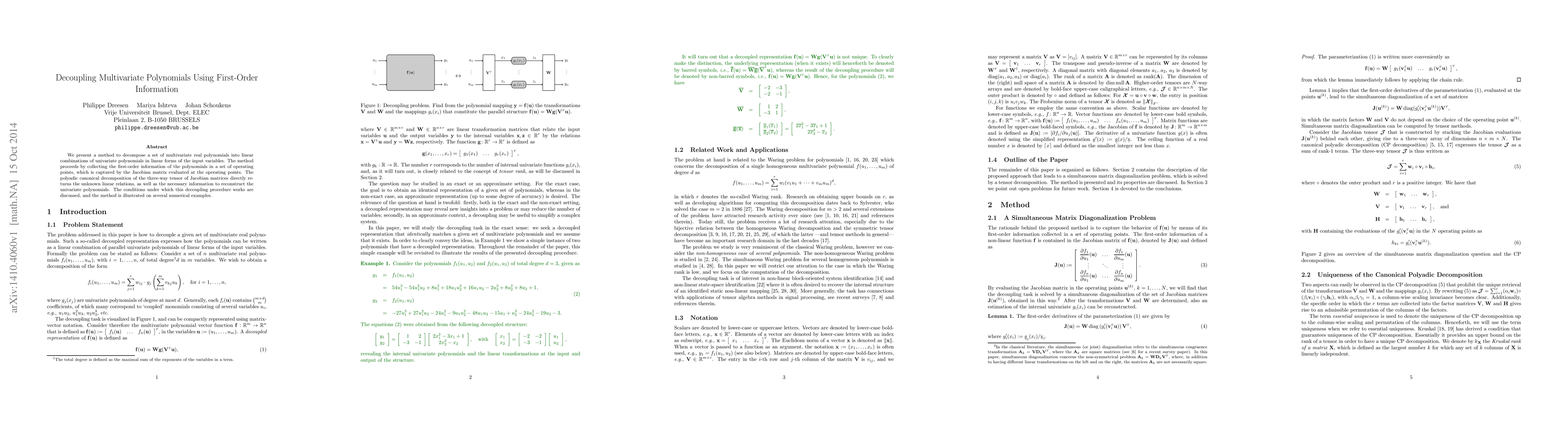We present a method to decompose a set of multivariate real polynomials into linear combinations of univariate polynomials in linear forms of the input variables. The method proceeds by collecting the first-order information of the polynomials in a set of operating points, which is captured by the Jacobian matrix evaluated at the operating points. The polyadic canonical decomposition of the three-way tensor of Jacobian matrices directly returns the unknown linear relations, as well as the necessary information to reconstruct the univariate polynomials. The conditions under which this decoupling procedure works are discussed, and the method is illustrated on several numerical examples.
