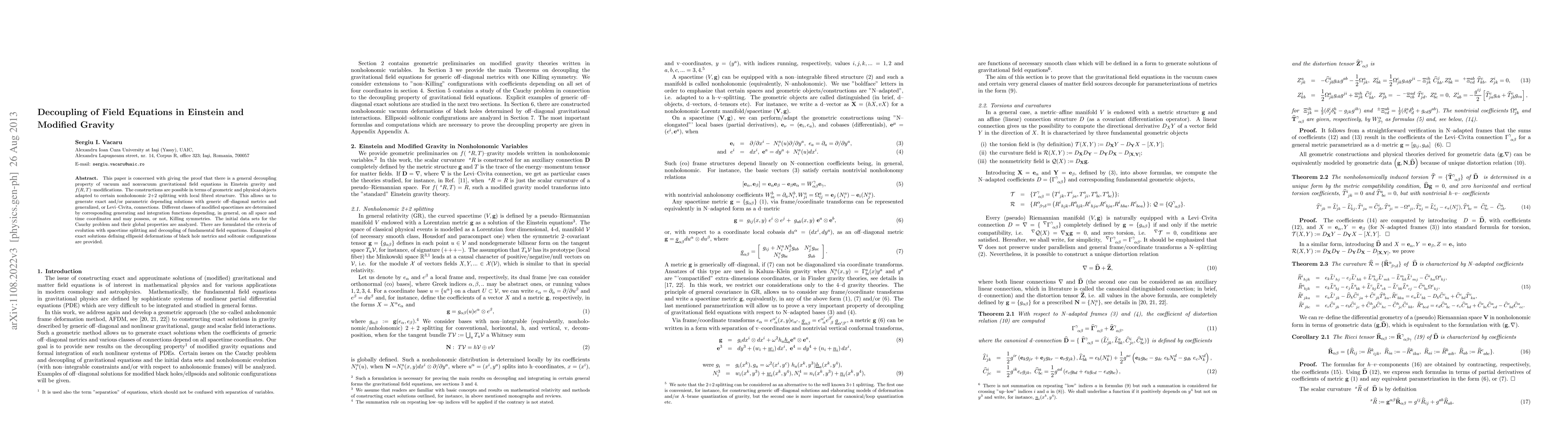 This paper is concerned with giving the proof that there is a general decoupling property of vacuum and nonvacuum gravitational field equations in Einstein gravity and $f(R,T)$-modifications. The constructions are possible in terms of geometric and physical objects adapted to certain nonholonomic 2+2 splitting with local fibred structure. This allows us to generate exact and/or parametric depending solutions with generic off-diagonal metrics and generalized, or Levi-Civita, connections. Different classes of modified spacetimes are determined by corresponding generating and integration functions depending, in general, on all space and time coordinates and may possess, or not, Killing symmetries. The initial data sets for the Cauchy problem and their global properties are analyzed. There are formulated the criteria of evolution with spacetime splitting and decoupling of fundamental field equations. Examples of exact solutions defining ellipsoid deformations of black hole metrics and solitonic configurations are provided.