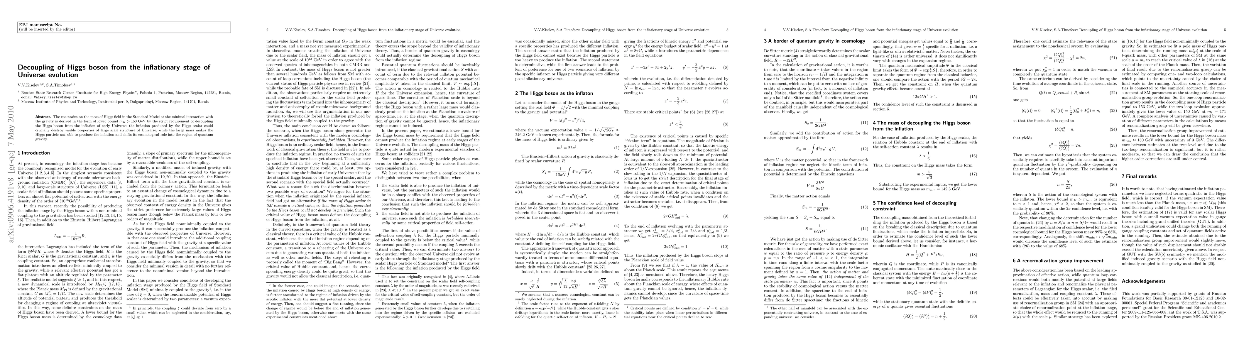 The constraint on the mass of Higgs field in the Standard Model at the minimal interaction with the gravity is derived in the form of lower bound $m_H> 150$ GeV by the strict requirement of decoupling the Higgs boson from the inflation of early Universe: the inflation produced by the Higgs scalar could crucially destroy visible properties of large scale structure of Universe, while the large mass makes the Higgs particle not able to produce the inflation and shifts its cosmological role into the region of quantum gravity.