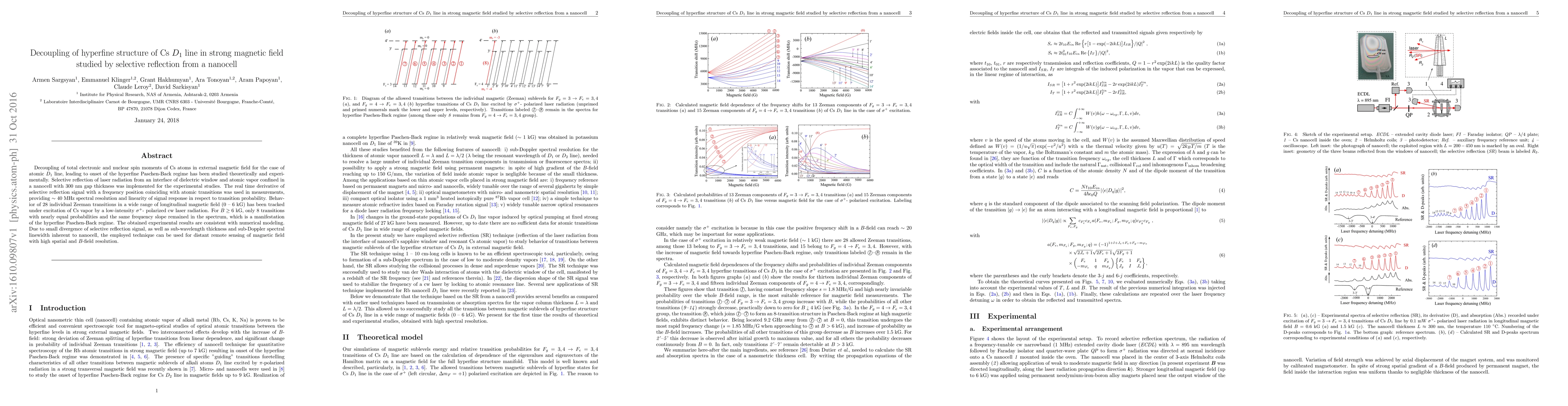 This paper investigates the decoupling of hyperfine structure in Cs $D_1$ line under strong magnetic fields, demonstrating the onset of the hyperfine Paschen-Back regime both theoretically and experimentally. Using selective reflection from a nanocell, the study tracks 28 Zeeman transitions, revealing a regime where only 8 transitions persist at high magnetic fields, consistent with numerical modeling, and suggesting potential for high-resolution remote sensing.