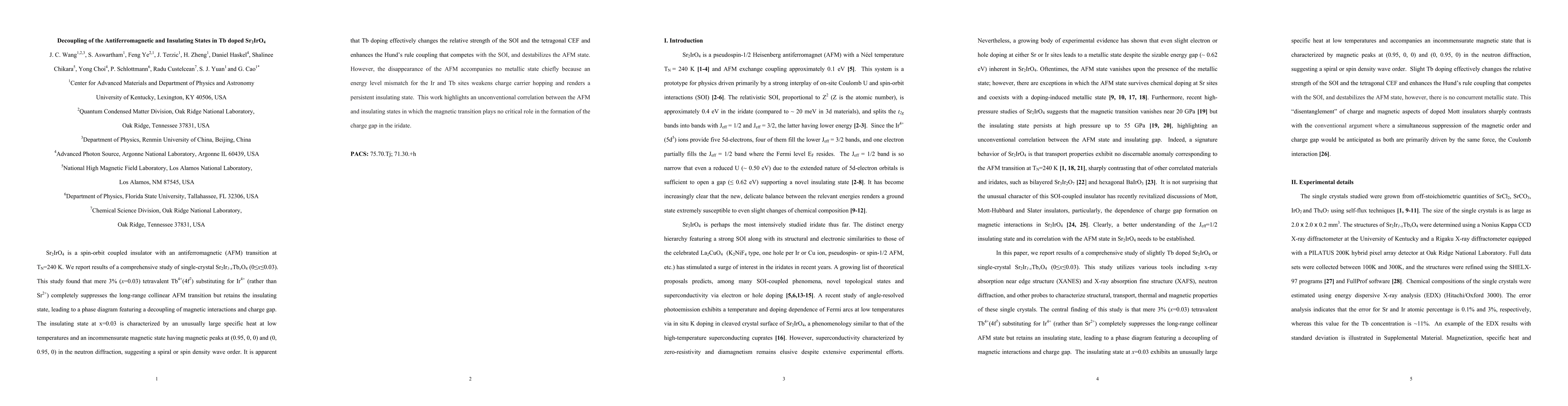 This study reveals that 3% Tb doping in Sr2IrO4 suppresses the antiferromagnetic transition while preserving the insulating state, demonstrating a decoupling of magnetic and insulating phases. The insulating state at low temperatures exhibits a large specific heat and an incommensurate magnetic order, indicating a spiral or spin density wave, highlighting an unconventional relationship between magnetic and charge states in iridates.