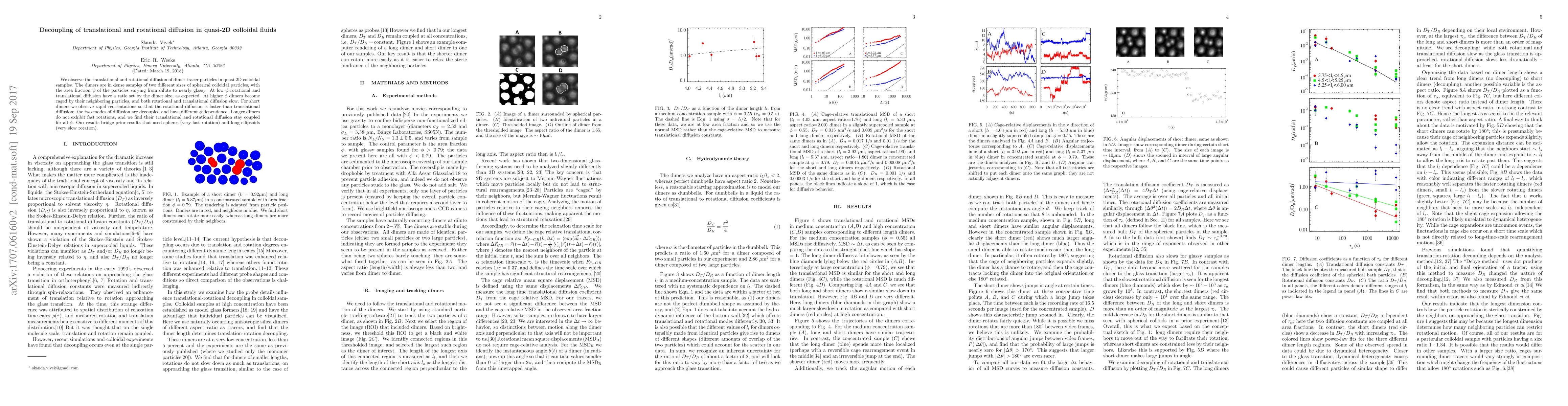 This study investigates the decoupling of translational and rotational diffusion in quasi-2D colloidal fluids, finding that short dimers exhibit faster rotational diffusion than translational diffusion at higher particle concentrations, while longer dimers maintain coupled diffusion, bridging prior findings on spherical and ellipsoidal particles.