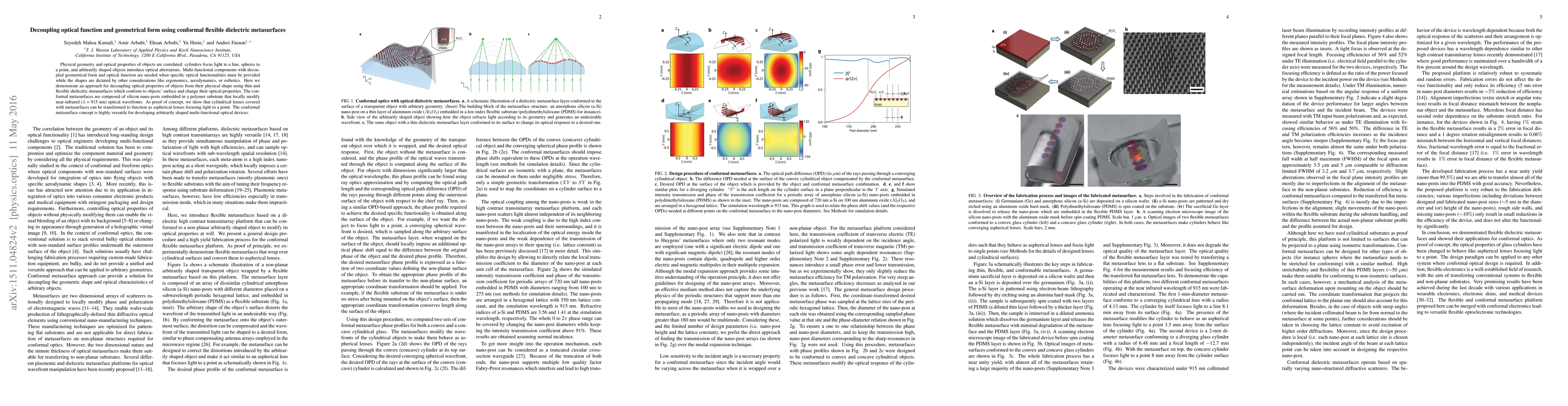 This paper demonstrates a method to decouple optical properties from physical geometry using conformal flexible dielectric metasurfaces. The metasurfaces, composed of silicon nano-posts in a polymer substrate, can modify near-infrared optical wavefronts, enabling cylindrical lenses to function as aspherical lenses, showcasing the potential for versatile multi-functional optical devices.