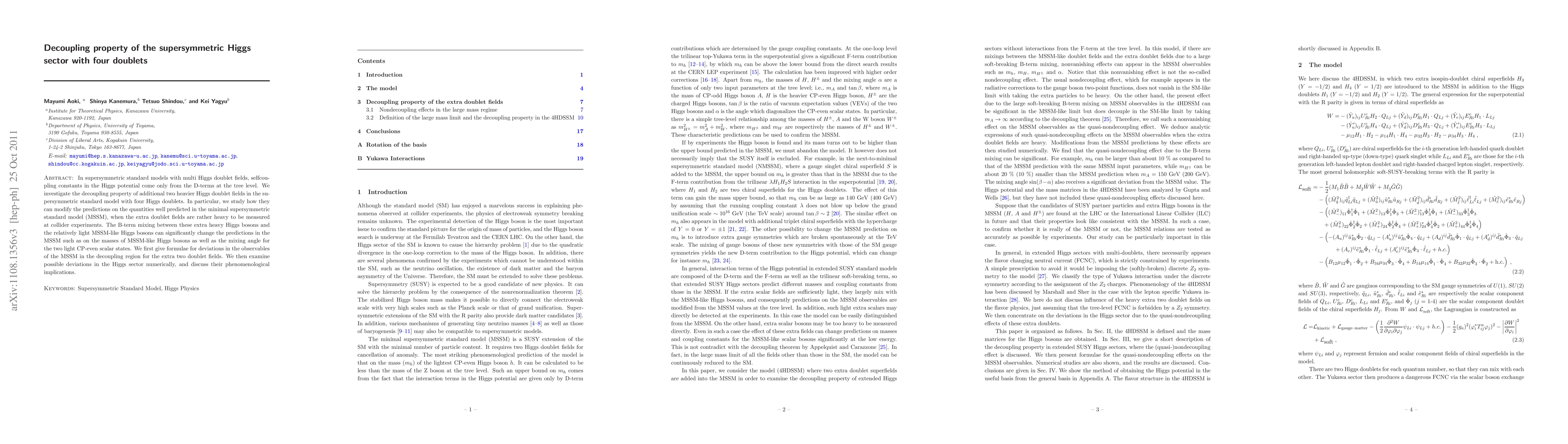 This paper investigates the decoupling properties of additional heavier Higgs doublets in a four-doublet supersymmetric model, focusing on how they modify MSSM predictions when too heavy for collider detection. It provides formulae for deviations in MSSM observables and discusses the phenomenological implications of B-term mixing between extra heavy and light Higgs bosons.