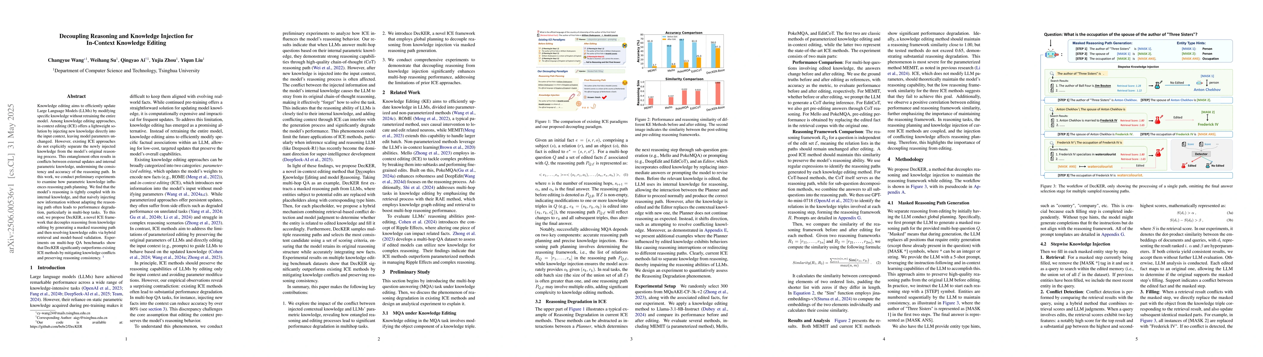 DecKER, a novel In-Context Editing (ICE) framework that decouples reasoning from knowledge injection by generating a masked reasoning path and resolving edits via hybrid retrieval and model-based validation.