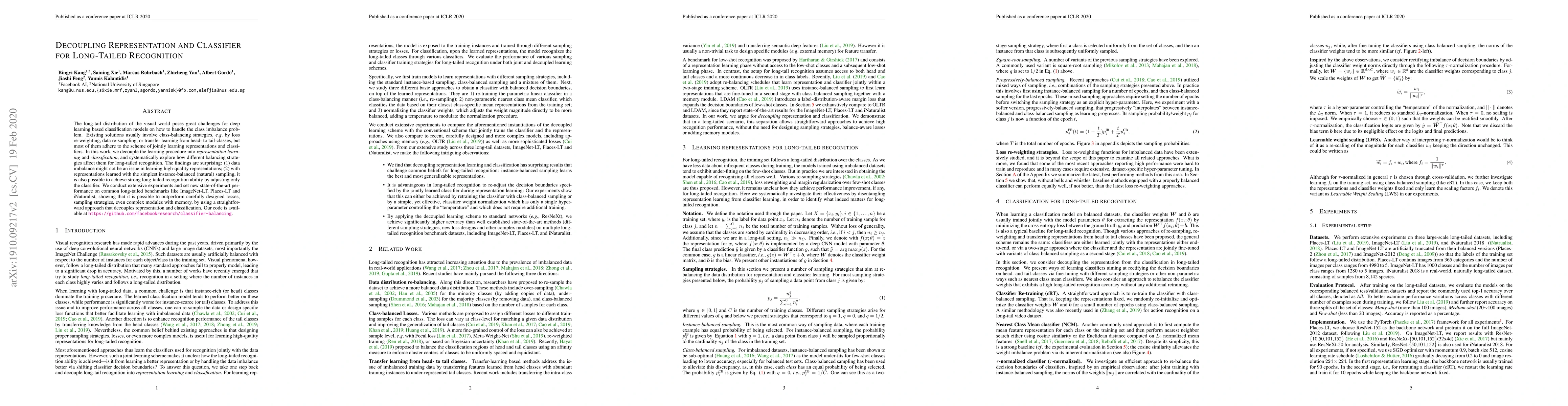The long-tail distribution of the visual world poses great challenges for deep learning based classification models on how to handle the class imbalance problem. Existing solutions usually involve class-balancing strategies, e.g., by loss re-weighting, data re-sampling, or transfer learning from head- to tail-classes, but most of them adhere to the scheme of jointly learning representations and classifiers. In this work, we decouple the learning procedure into representation learning and classification, and systematically explore how different balancing strategies affect them for long-tailed recognition. The findings are surprising: (1) data imbalance might not be an issue in learning high-quality representations; (2) with representations learned with the simplest instance-balanced (natural) sampling, it is also possible to achieve strong long-tailed recognition ability by adjusting only the classifier. We conduct extensive experiments and set new state-of-the-art performance on common long-tailed benchmarks like ImageNet-LT, Places-LT and iNaturalist, showing that it is possible to outperform carefully designed losses, sampling strategies, even complex modules with memory, by using a straightforward approach that decouples representation and classification. Our code is available at https://github.com/facebookresearch/classifier-balancing.