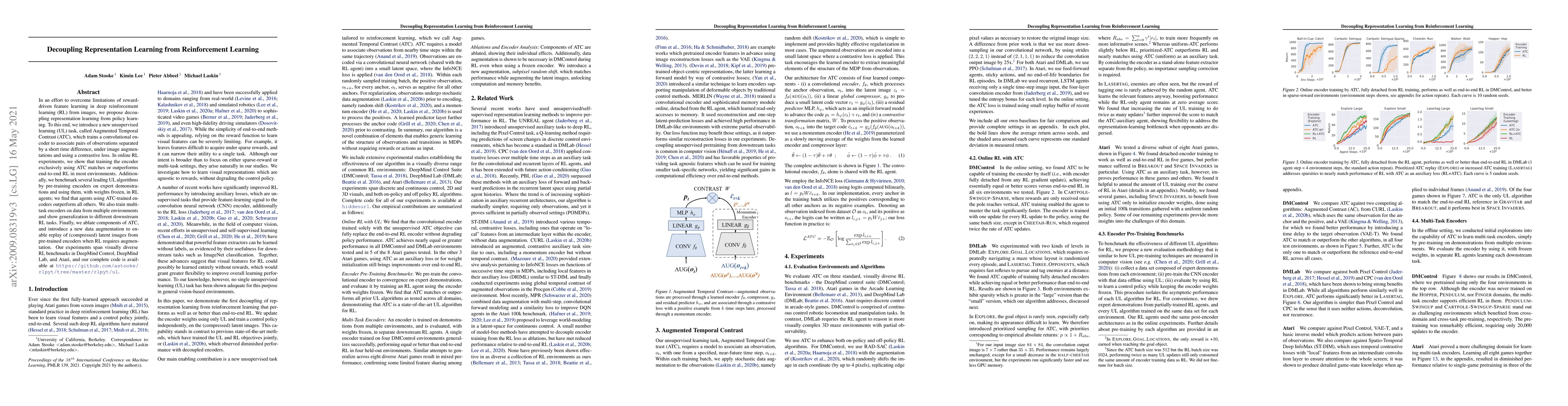 The paper proposes decoupling representation learning from policy learning in reinforcement learning (RL) by introducing a new unsupervised learning (UL) task, Augmented Temporal Contrast (ATC). ATC trains a convolutional encoder to associate pairs of observations separated by a short time difference under image augmentations using a contrastive loss.