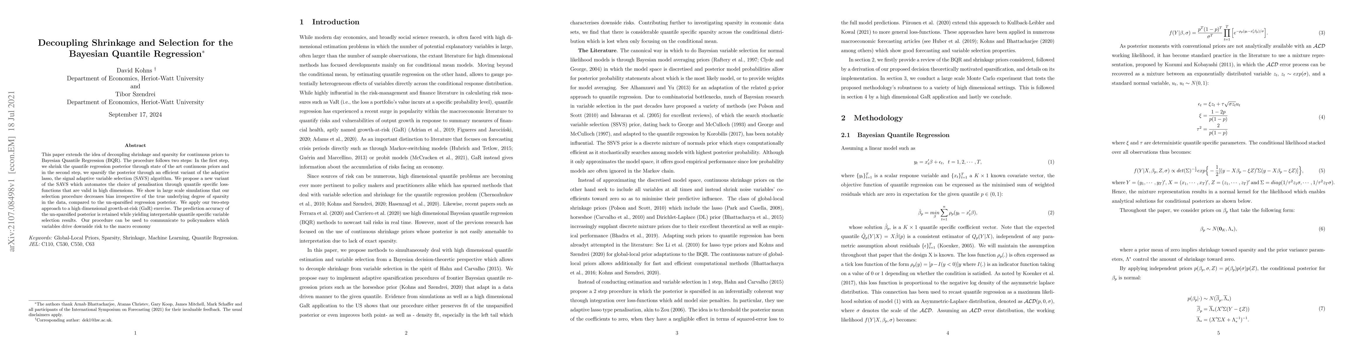 This paper proposes a two-step method for Bayesian Quantile Regression that first shrinks the posterior using advanced continuous priors, then sparsifies it with a new variant of the adaptive lasso. The method maintains prediction accuracy while providing interpretable quantile-specific variable selection, useful for communicating economic risks to policymakers.