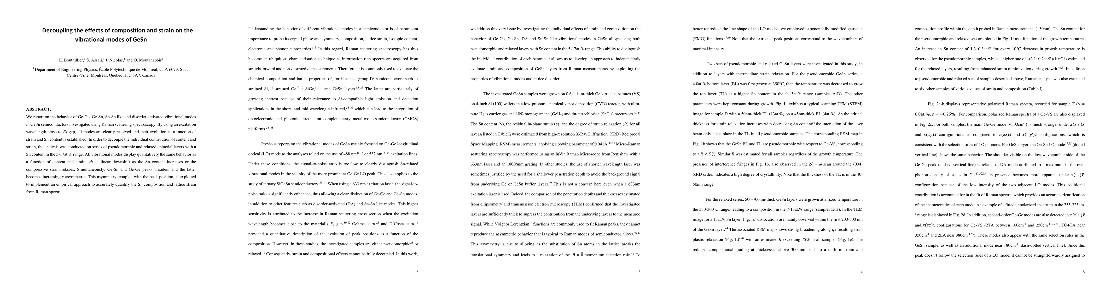This study investigates the vibrational modes in GeSn semiconductors using Raman spectroscopy, revealing how composition and strain affect these modes. An empirical method based on Raman spectra is developed to quantify Sn content and lattice strain, showing a linear downshift with increasing Sn or relaxed compressive strain.