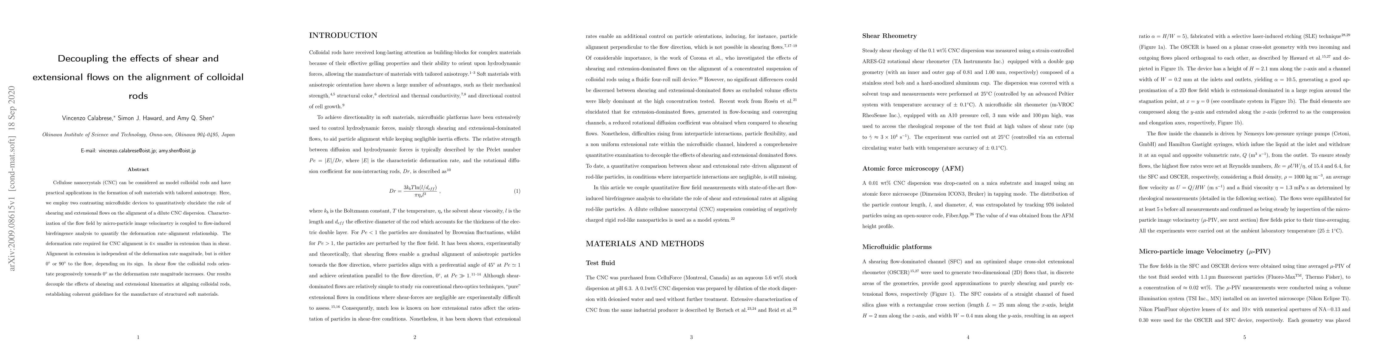 This study investigates how shear and extensional flows affect the alignment of cellulose nanocrystals (CNC) using microfluidic devices. It finds that CNC alignment requires 4 times less deformation in extension compared to shear, and provides guidelines for creating structured soft materials.