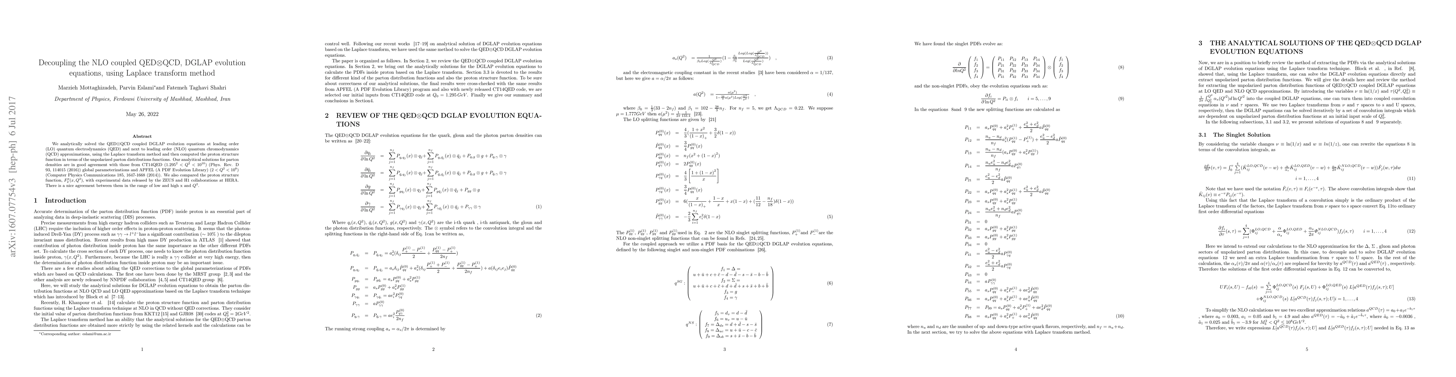 This paper presents an analytical solution to the coupled QED $\otimes$ QCD DGLAP evolution equations using the Laplace transform method, yielding parton densities that match existing global parameterizations. The proton structure function computed from these solutions agrees well with experimental data from the ZEUS and H1 collaborations.