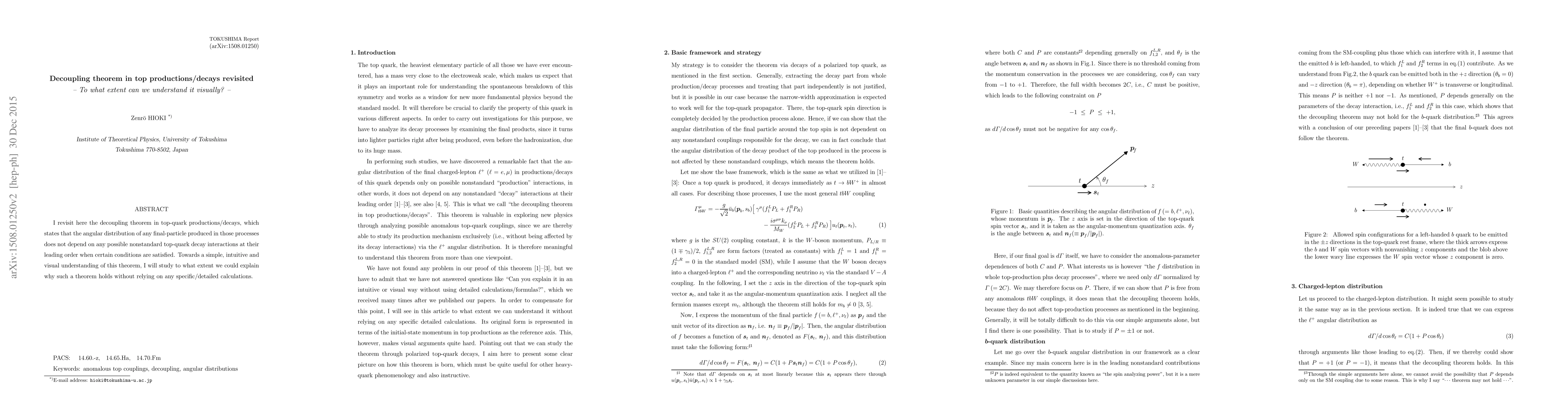 This paper revisits the decoupling theorem in top-quark productions/decays, asserting that the angular distribution of final particles remains unaffected by nonstandard top-quark decay interactions at leading order under certain conditions. The study aims to provide a simple, intuitive, and visual understanding of why this theorem holds without resorting to detailed calculations.