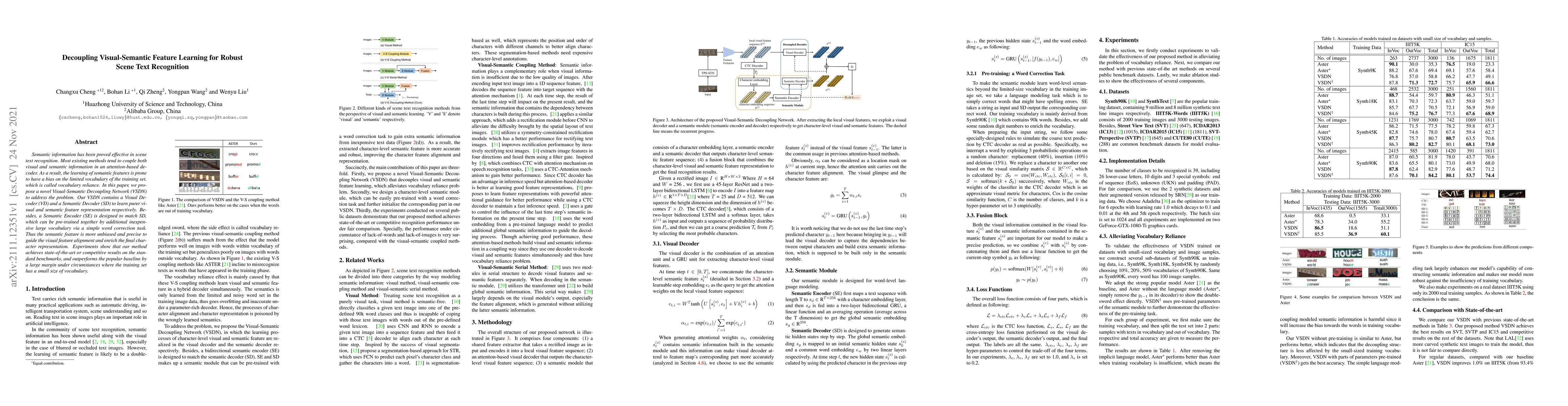 This paper proposes a Visual-Semantic Decoupling Network (VSDN) to enhance scene text recognition by separating visual and semantic feature learning, reducing vocabulary reliance, and achieving better performance, especially with limited training vocabulary. The VSDN includes a Visual Decoder, Semantic Decoder, and Semantic Encoder, which together produce more precise semantic features to guide visual feature alignment.