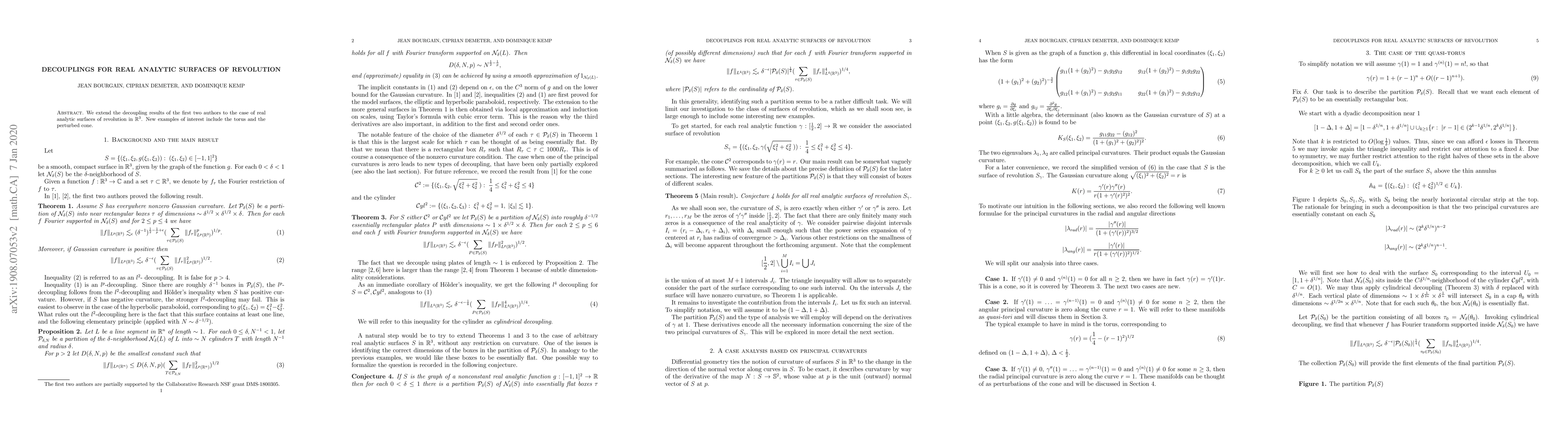 This paper extends decoupling results to real analytic surfaces of revolution in $\mathbb{R}^3$, focusing on the torus and perturbed cone as notable examples. The study provides new insights into the mathematical properties of these surfaces.