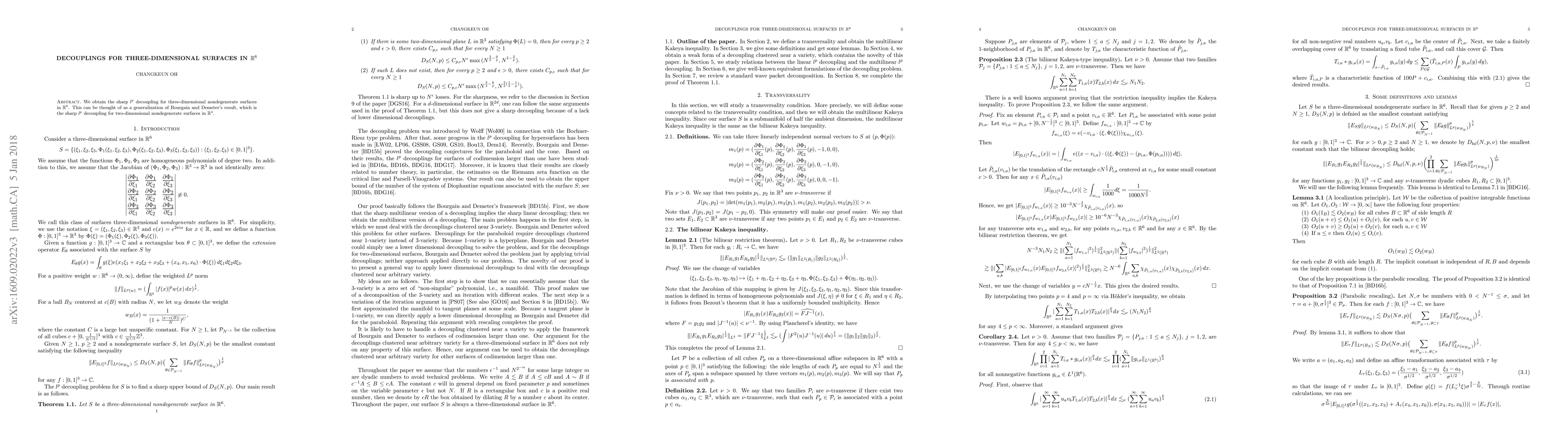 We obtain the sharp $l^p$ decoupling for three-dimensional nondegenerate surfaces in $\mathbb{R}^6$. This can be thought of as a generalization of Bourgain and Demeter's result, which is the sharp $l^p$ decoupling for two-dimensional nondegenerate surfaces in $\mathbb{R}^4$.